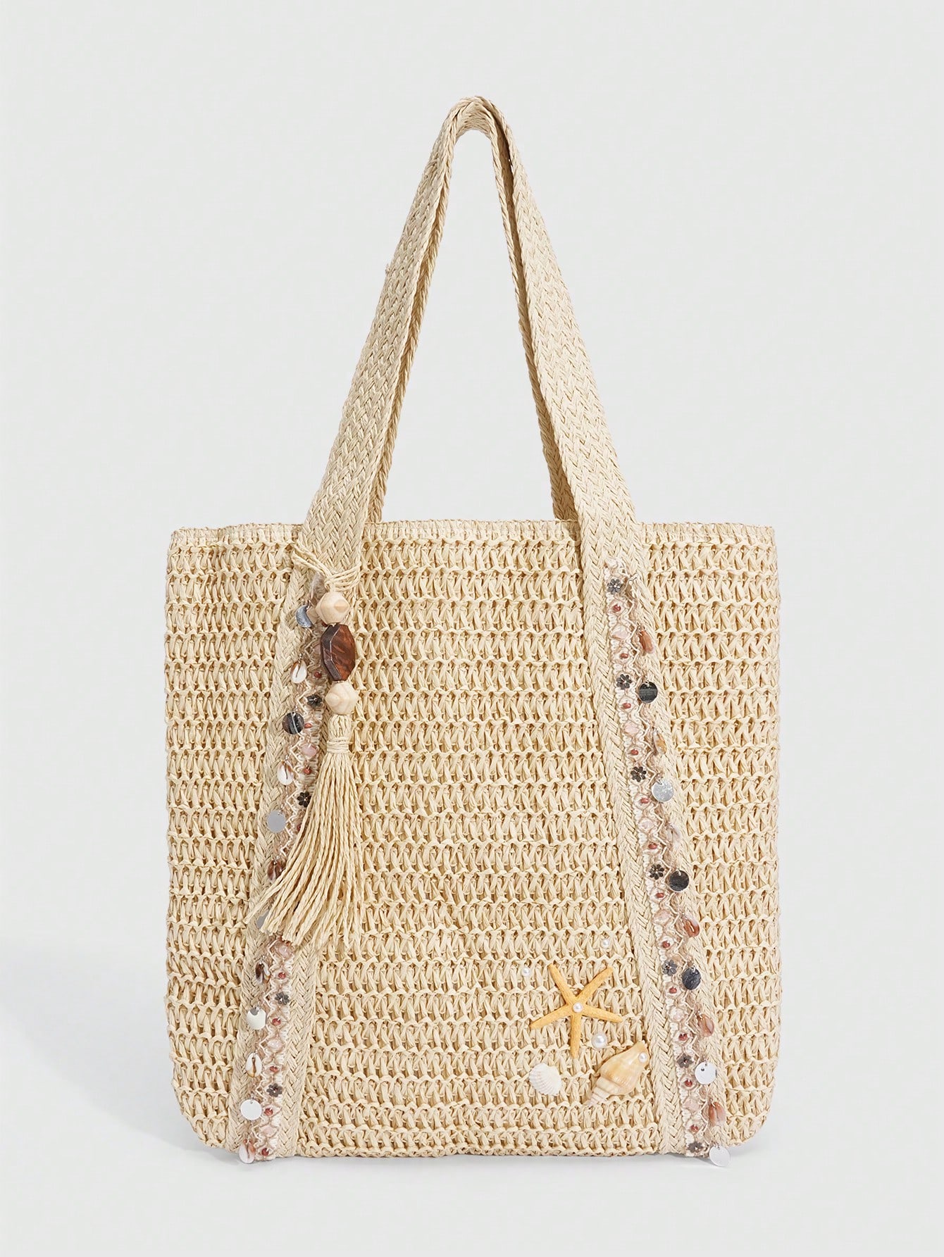 Fairycore 1pc Vacation-Themed Shell, Seashell, Coral, Pearl Decor Women Tote Bag, Large Capacity Floral Straw Beach Bag For Spring/Summer