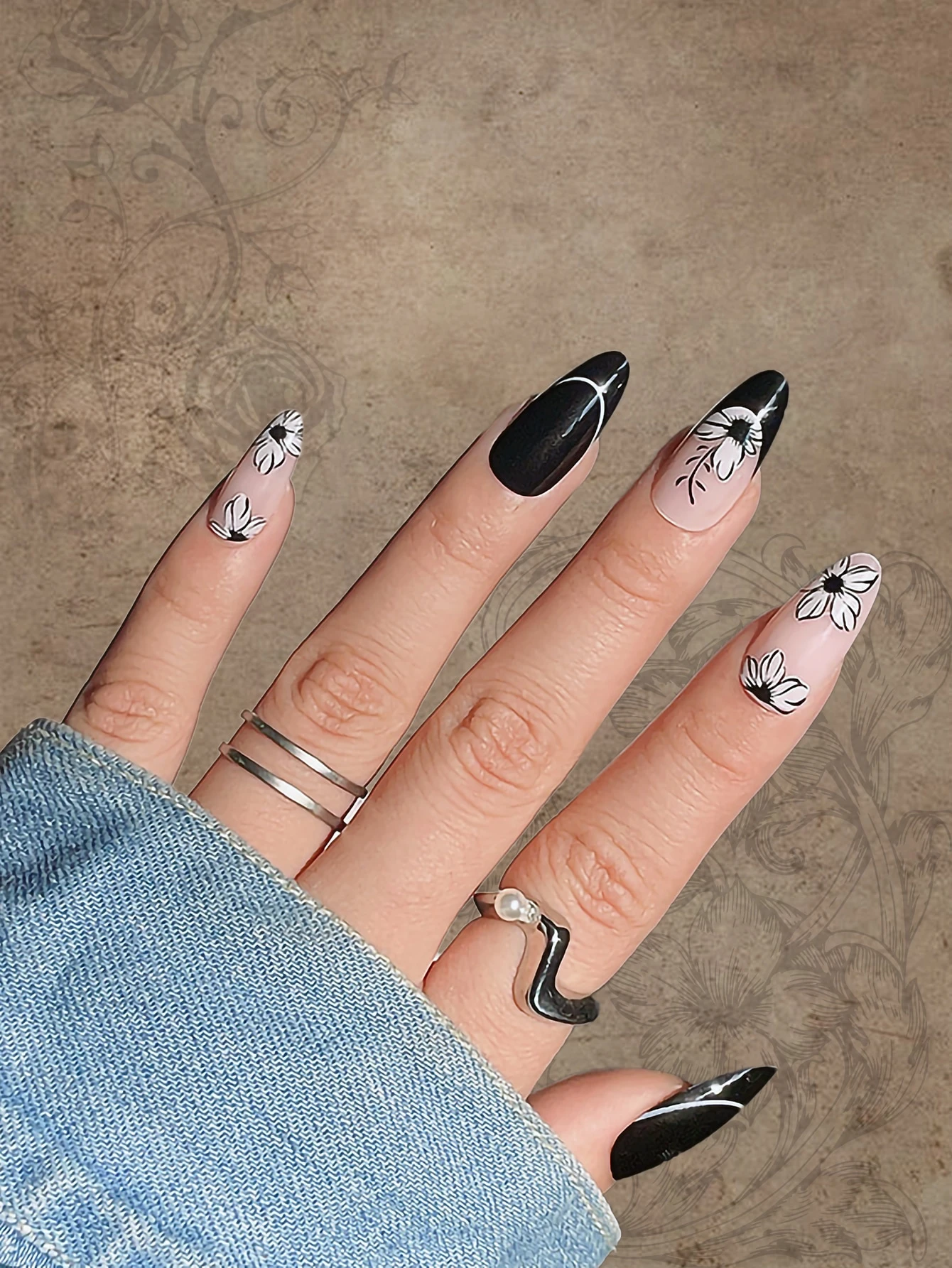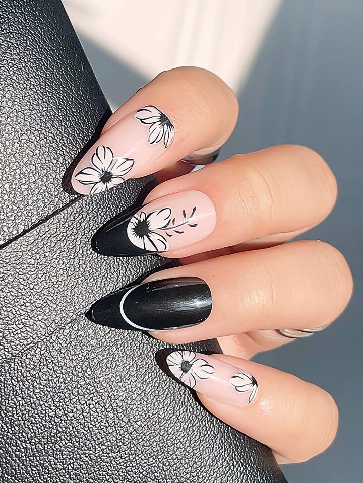 Fairycore 24pcs Almond Flower Print Fake Nail & 1sheet Tape