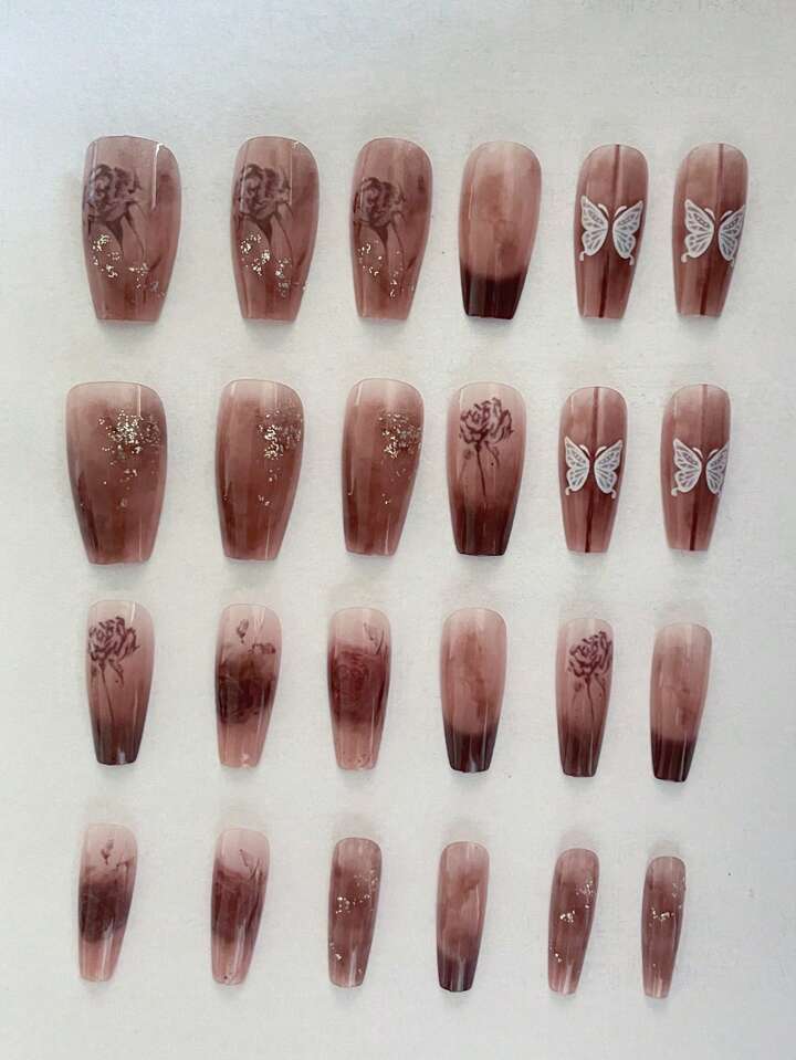 Fairycore 24pcs Short Coffin 3D Butterfly Decor Fake Nail & 1sheet Tape