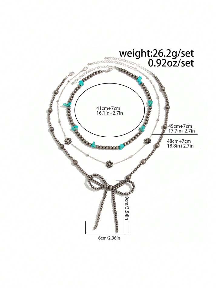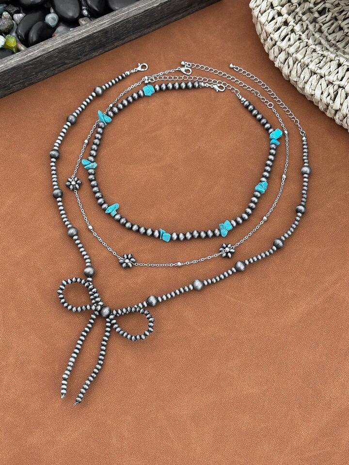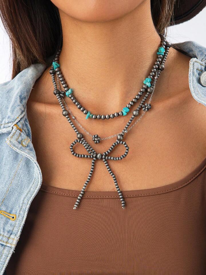 Fairycore 3pcs Set Fashionable Hippie Western Cowgirl Style Turquoise Beaded Necklace With Bow Decoration