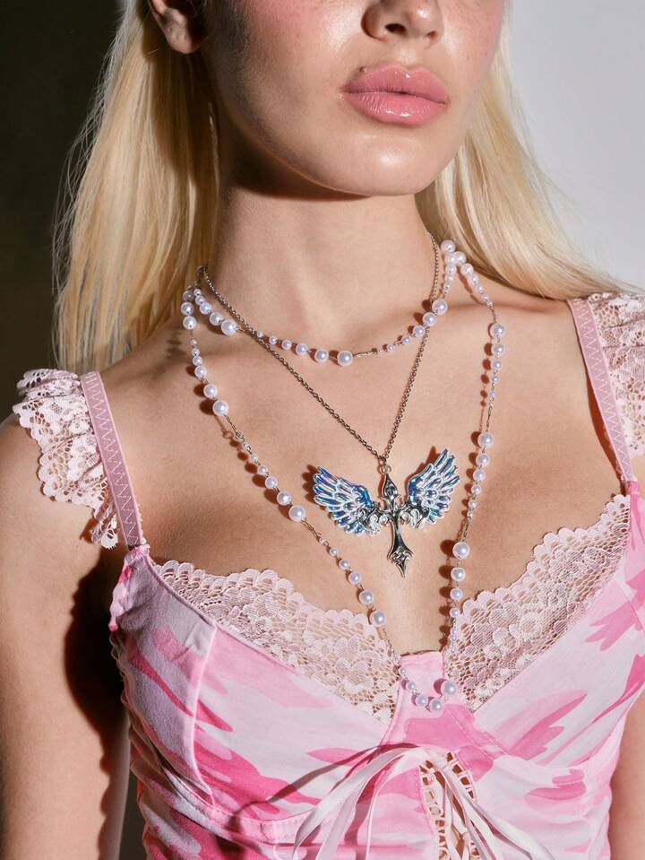 Fairycore 3pcs/Set Y2k Fashion Faux Pearl & Flame Cross Wing Necklace Suit For Women