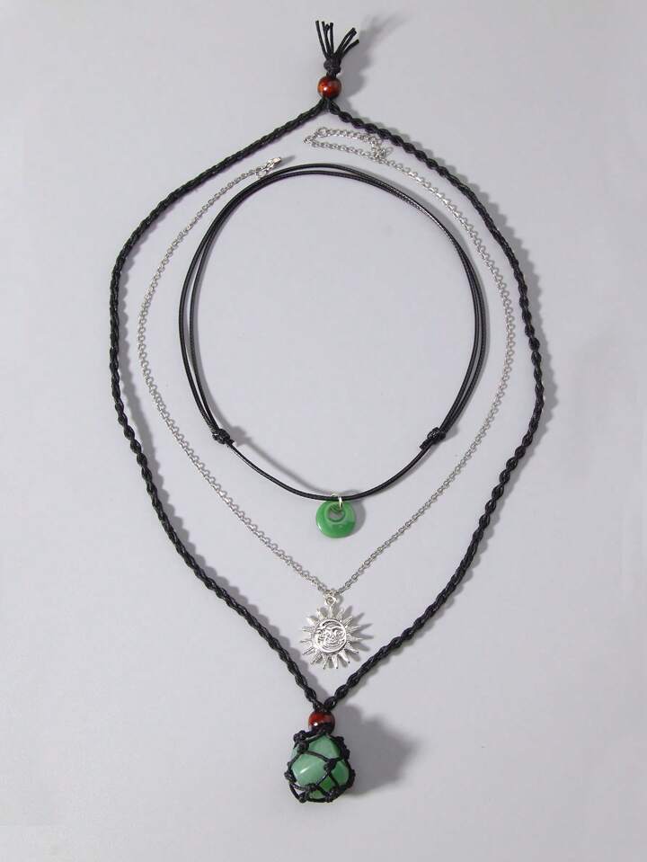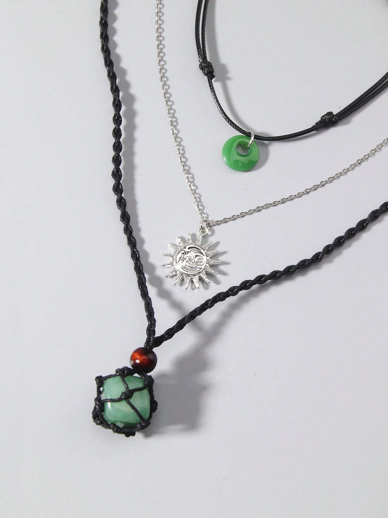Fairycore 3pcs Vintage Punk Sun Pendant Necklace, Handmade Woven Natural Stone Multi-Layer Necklace For Women