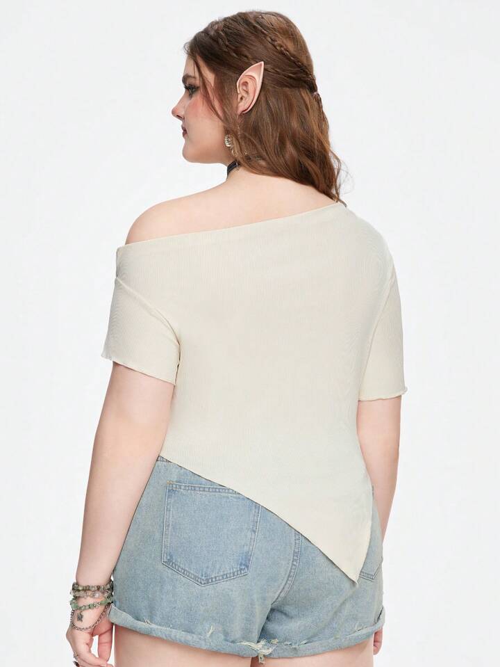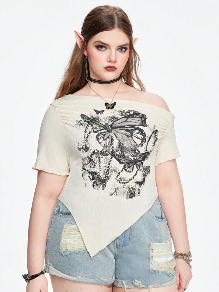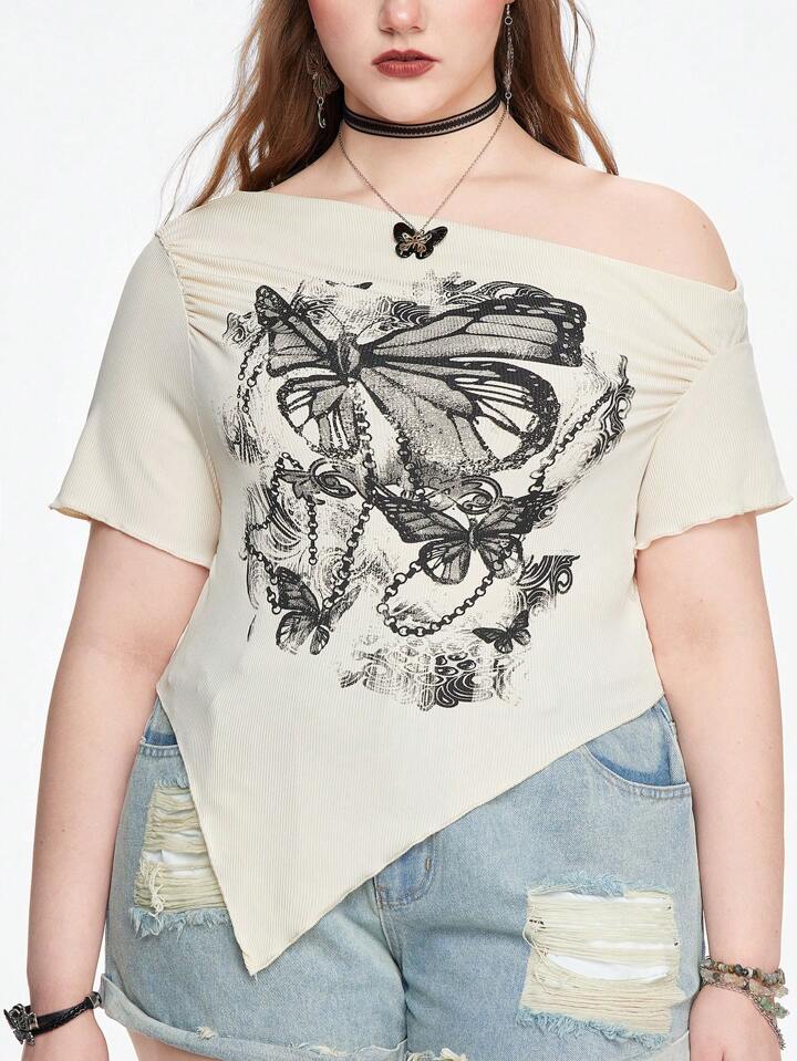 Fairycore Butterfly Print Asymmetric Hem Slim Plus Size Women's T-Shirt Top With Asymmetrical Neck And Pleats