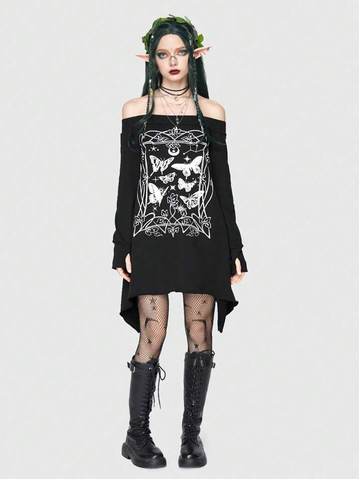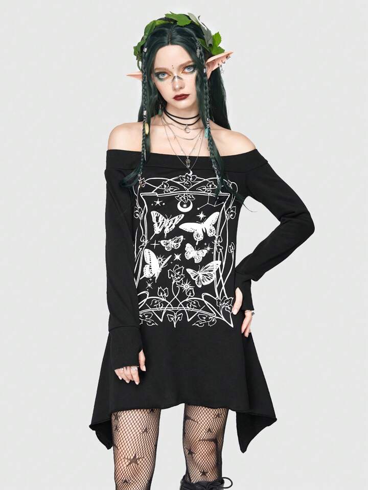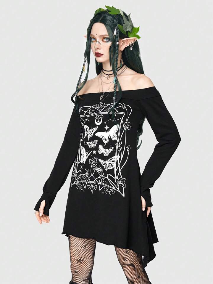 Fairycore Butterfly Print Off Shoulder Asymmetrical Hem Dress