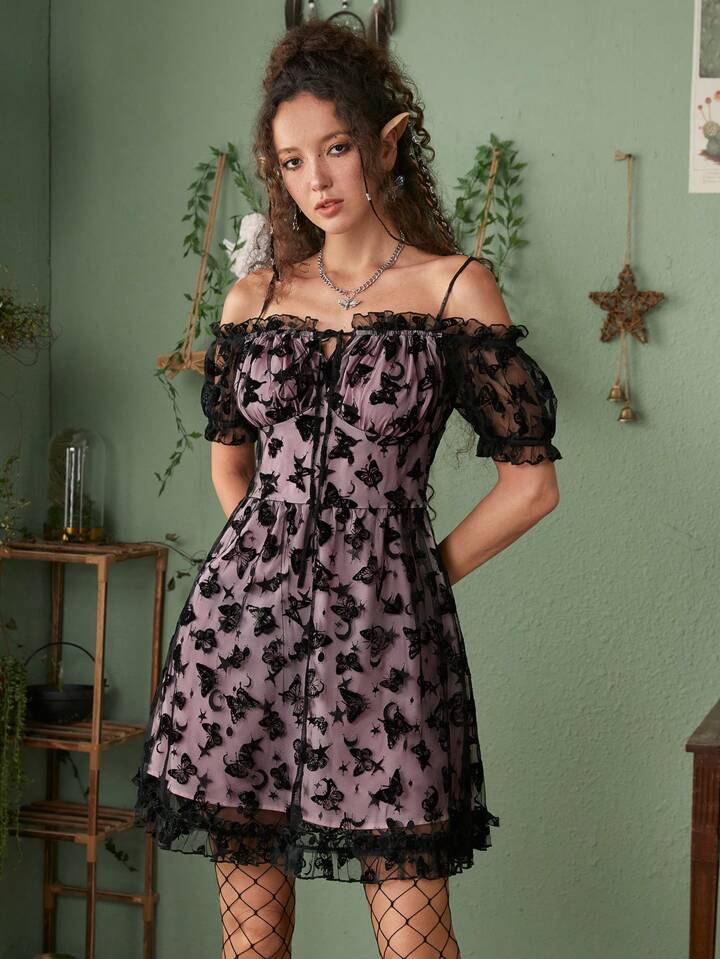 Fairycore Contrast Lace Butterfly Print Cold Shoulder Dress
