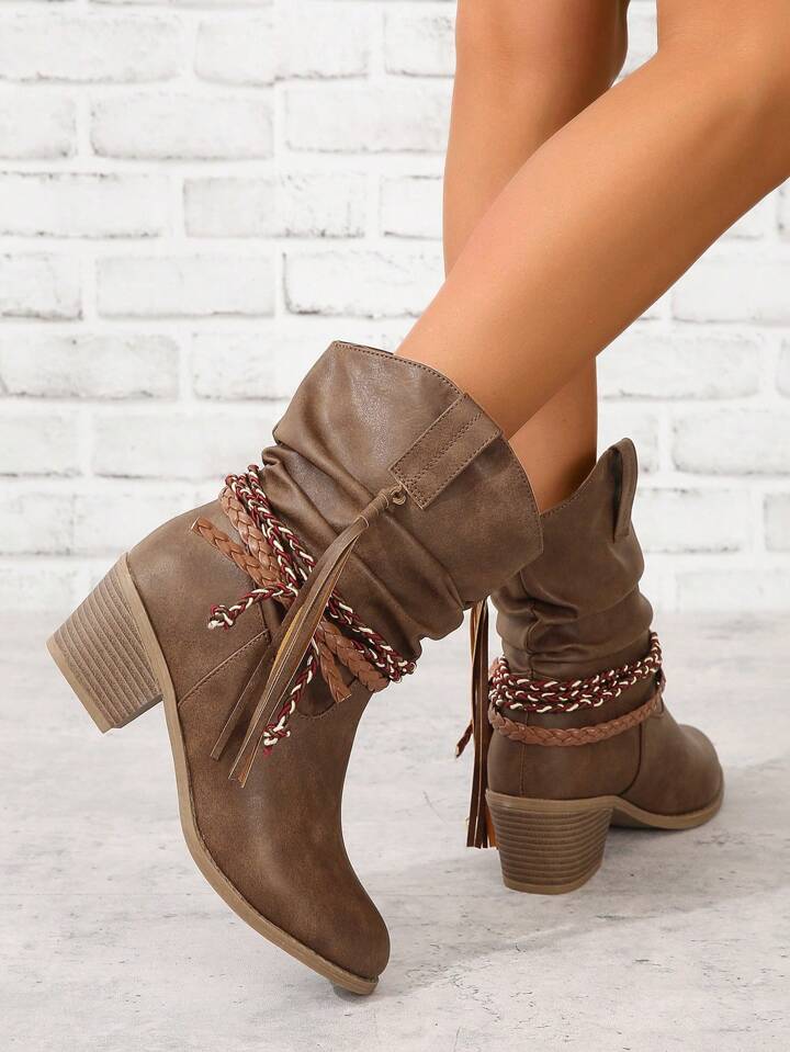 Fairycore Fall/Winter Brown Knee High Fringed & Braided & Buckled High Heeled Fashion Boots For Women,Western Style,Cowboy Boots