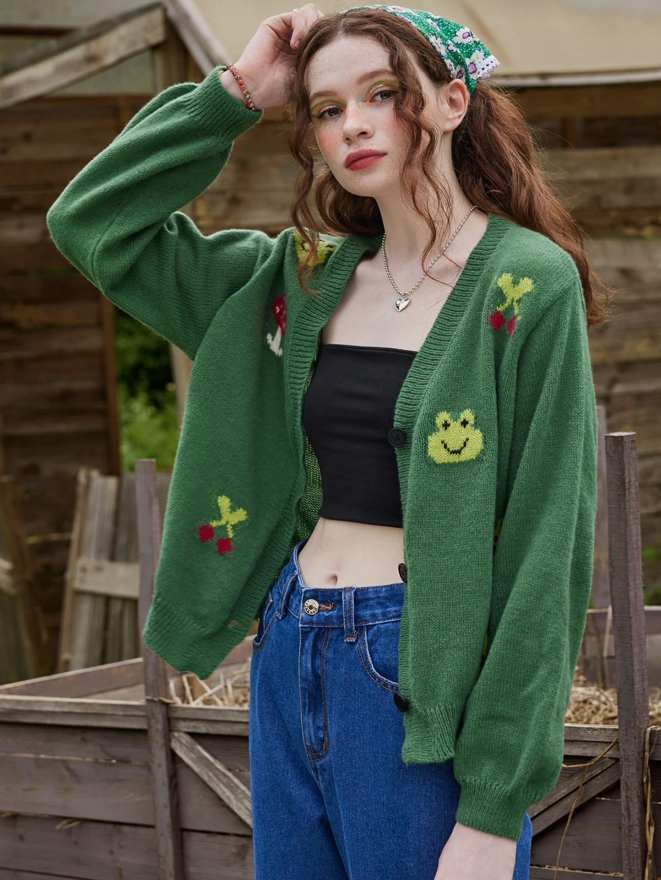 Fairycore Frog & Mushroom Pattern Button Front Cardigan