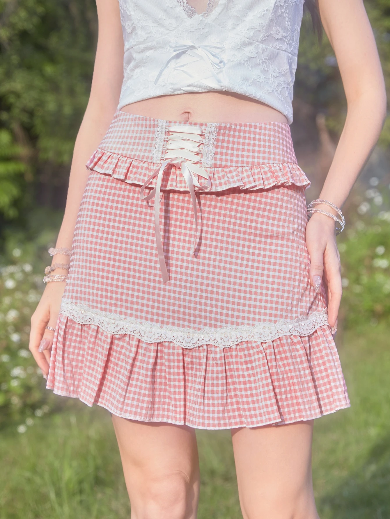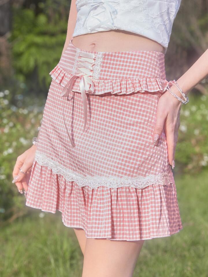 Fairycore Gingham Lace Up Contrast Lace Ruffle Hem Skirt