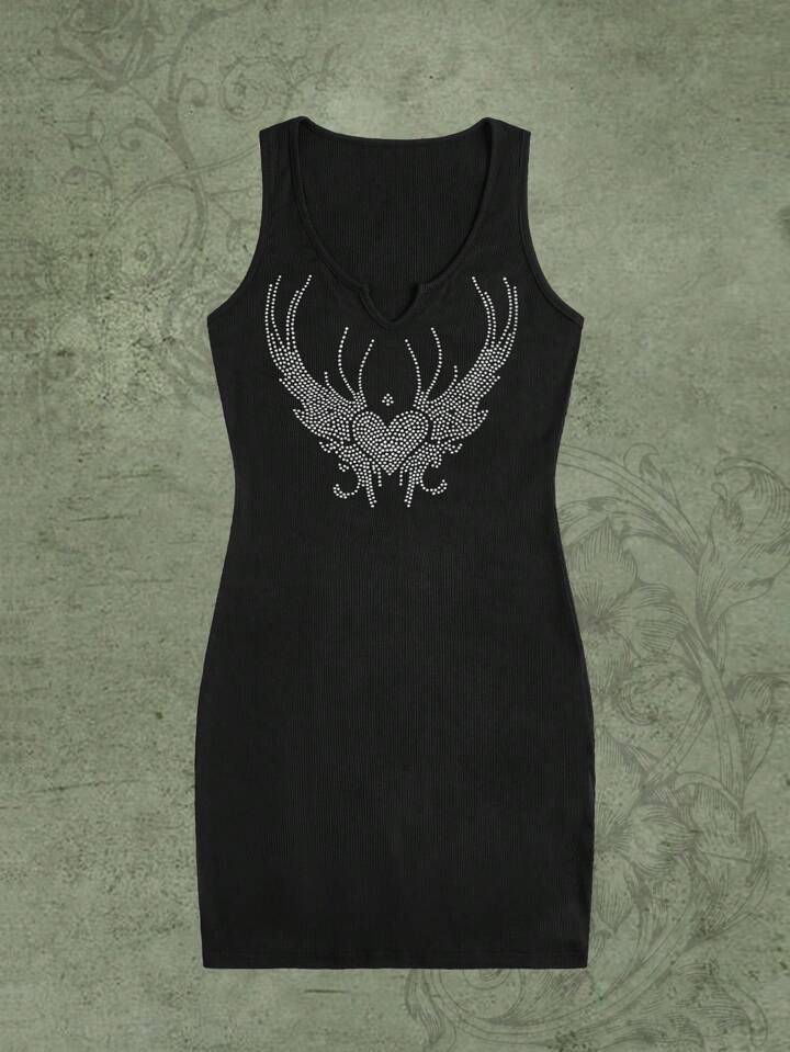 Fairycore Heart & Wings Graphic Rhinestone Decor Notched Neck Dress