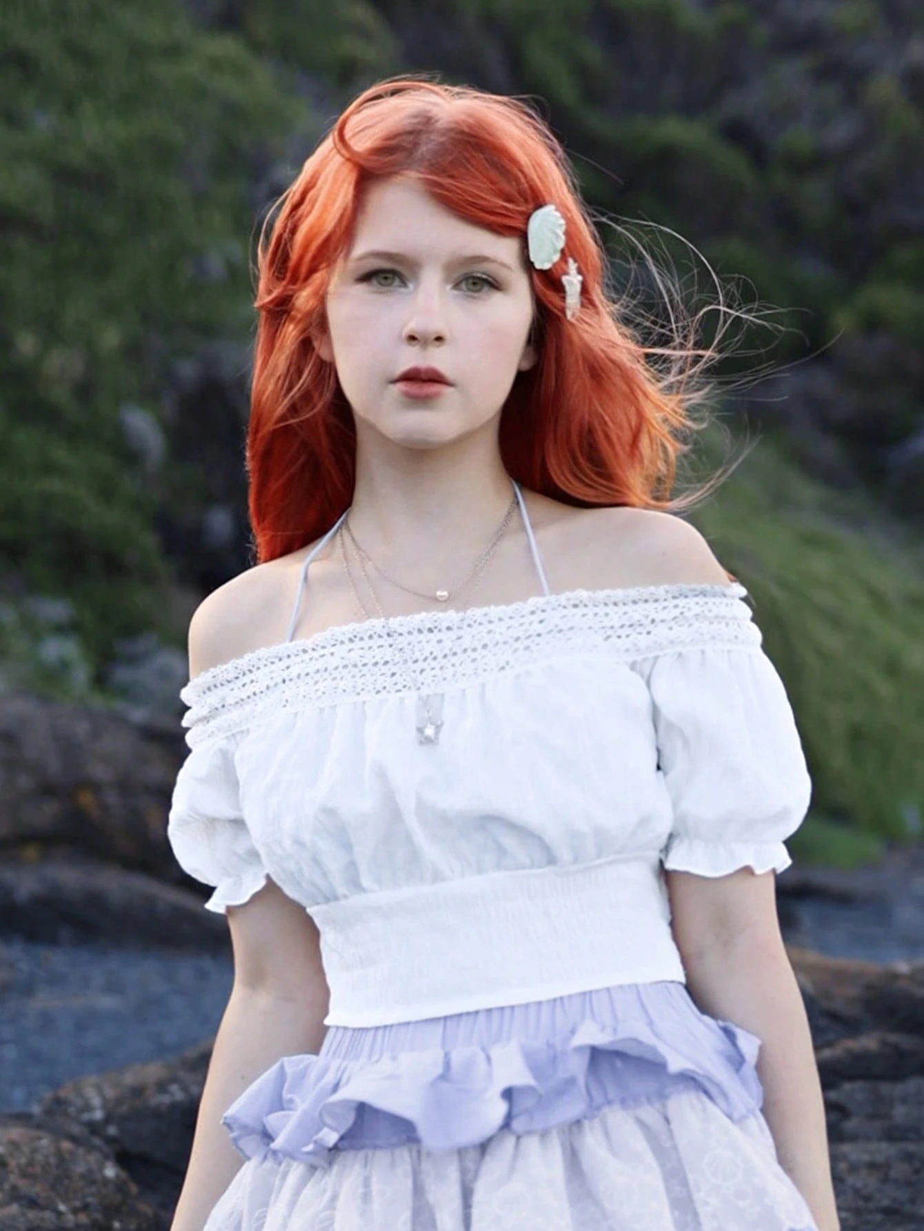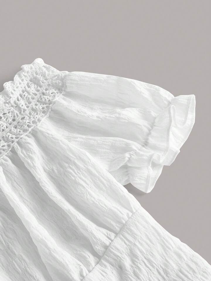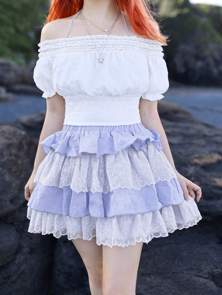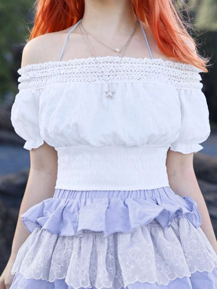 Fairycore Mermaid Solid Frill Trim Puff Sleeve Crop Blouse