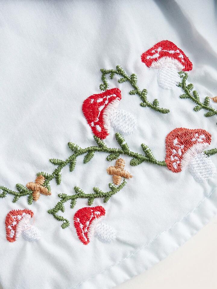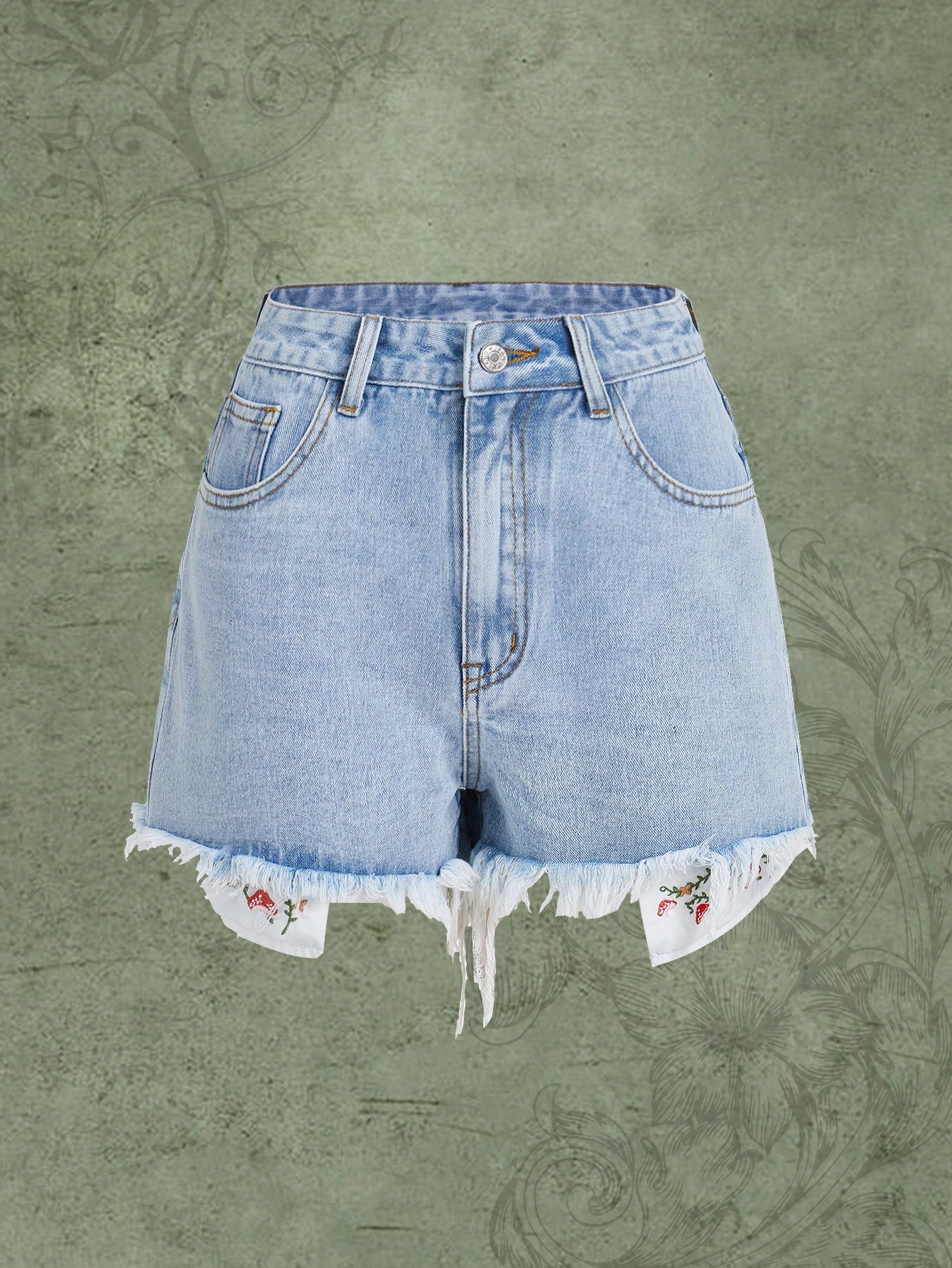 Fairycore Mushroom Embroidery Raw Hem Denim Shorts