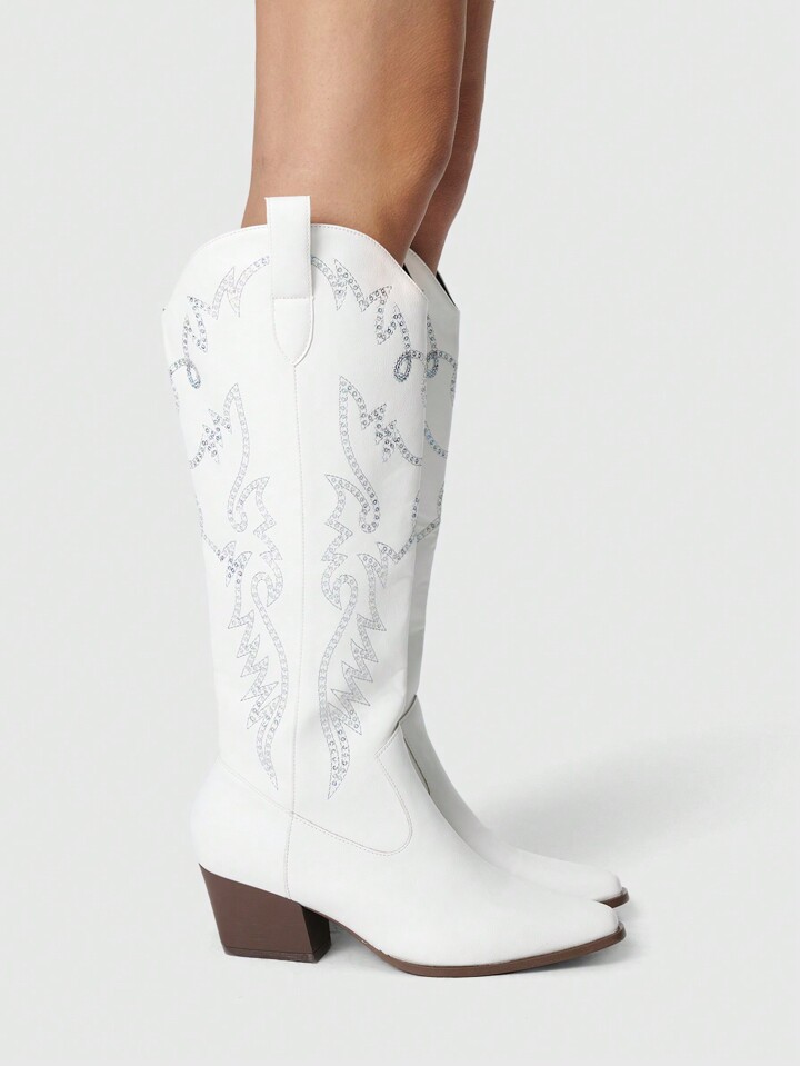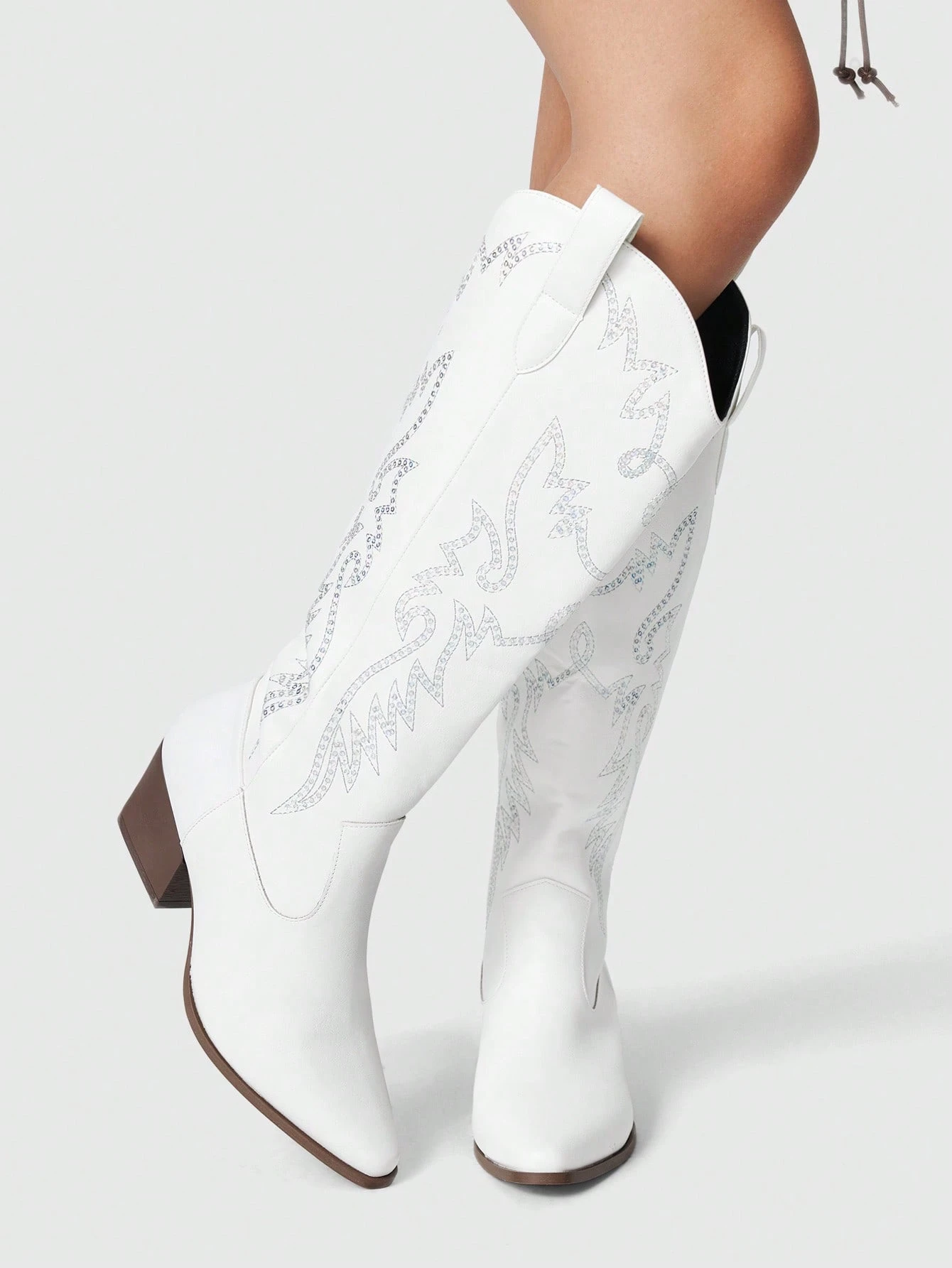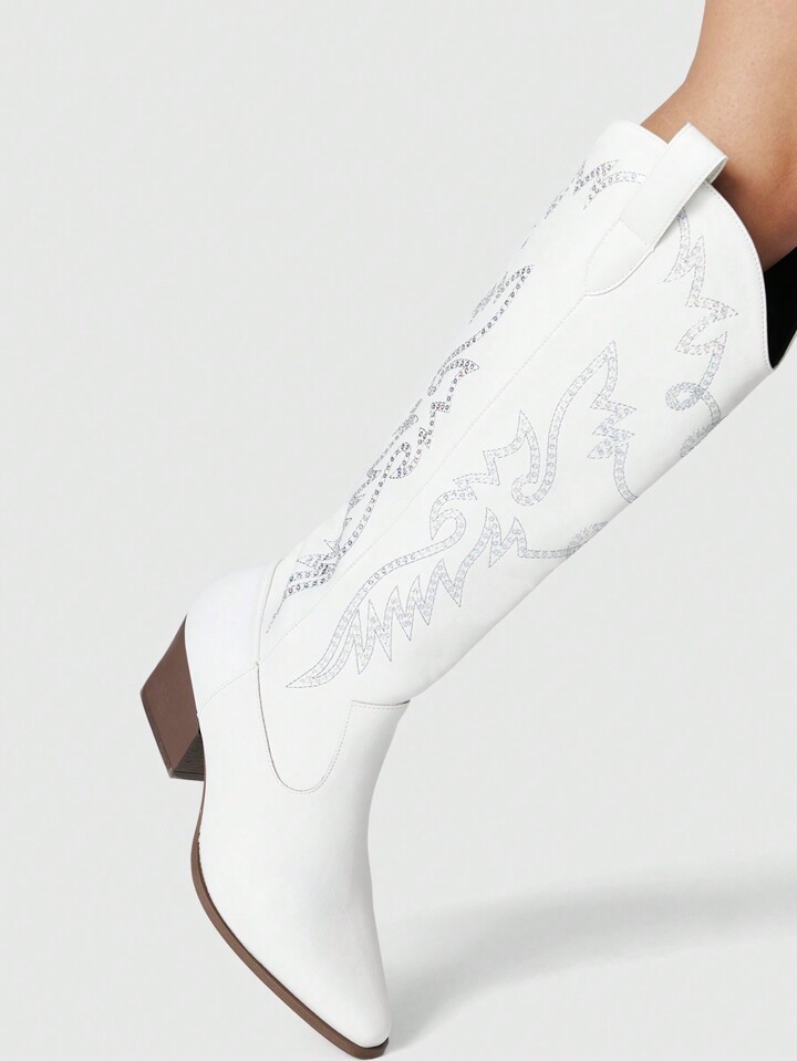 Fairycore Patterned Totem Embroidered Pointed Toe Low Heel Hippie Western Boots, Black PU Knee-High Cowgirl Boots For Everyday Wear