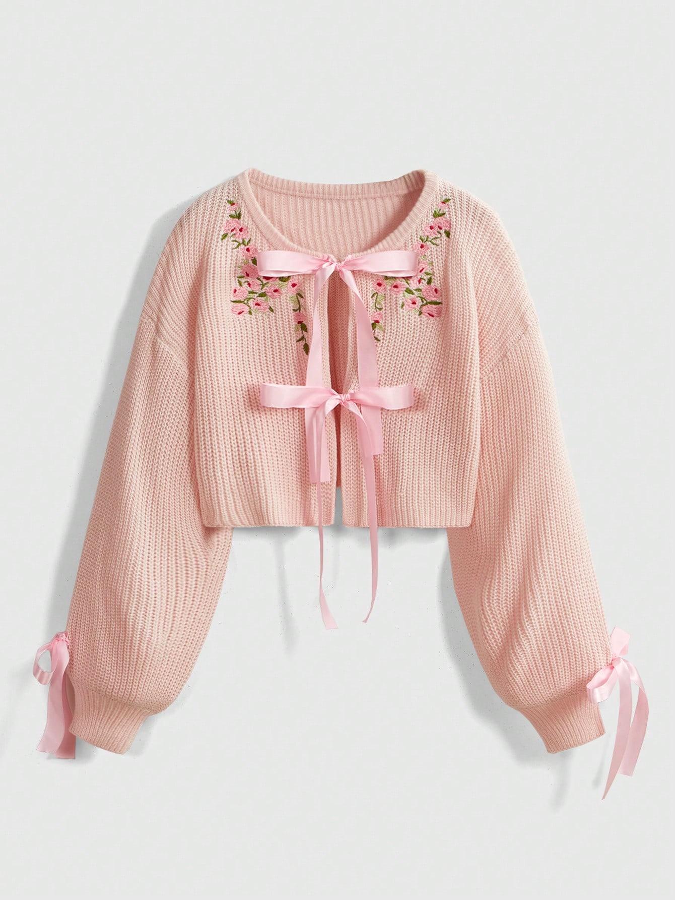 Fairycore Pink Sweet Romantic Floral Embroidery Cropped Bow Lightweight Cardigan, Elegant Sweet Girly Plus Size Cardigan, Pink Knit Cardigan