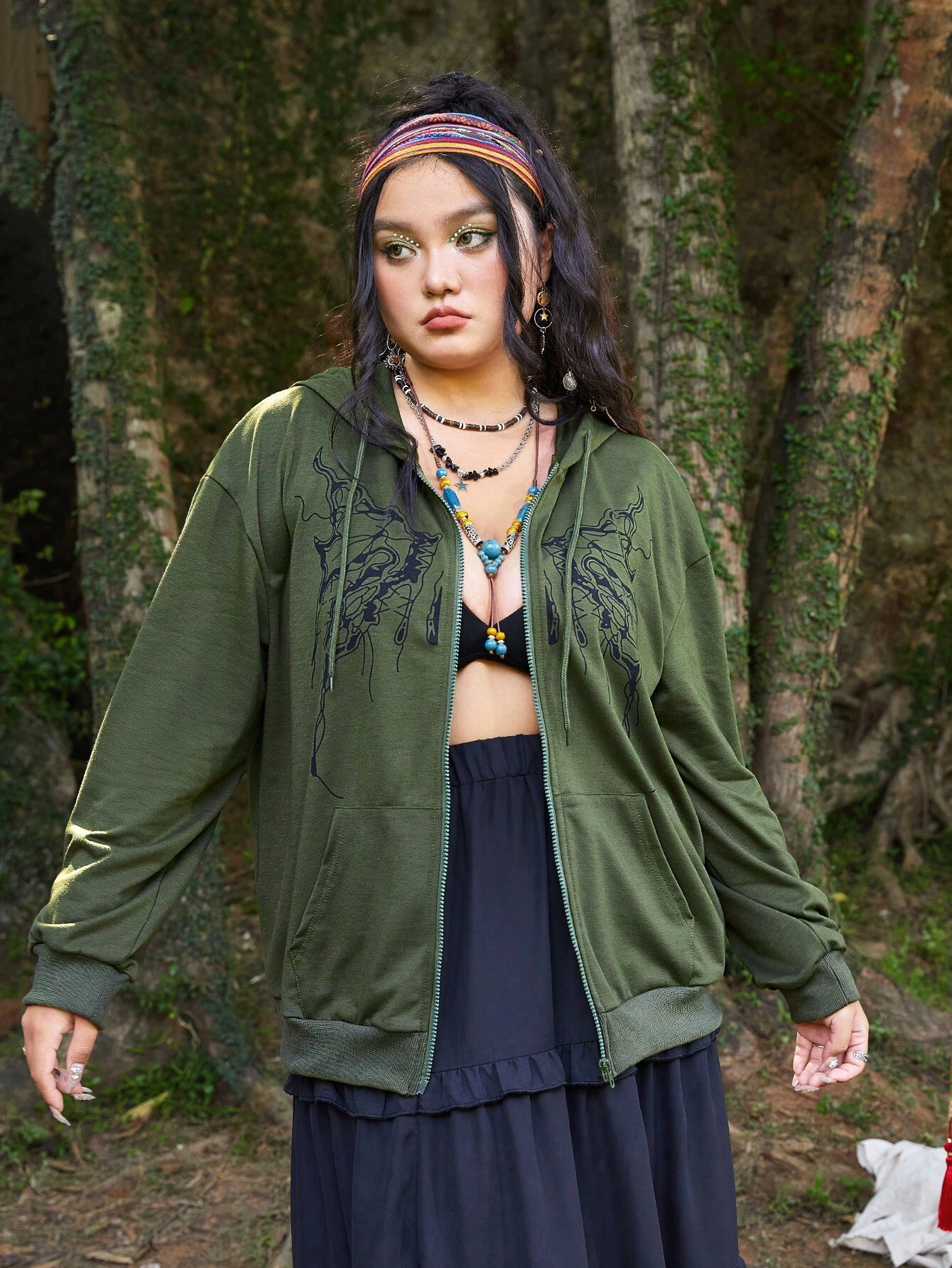Fairycore Plus Butterfly Print Zip Up Drawstring Hoodie