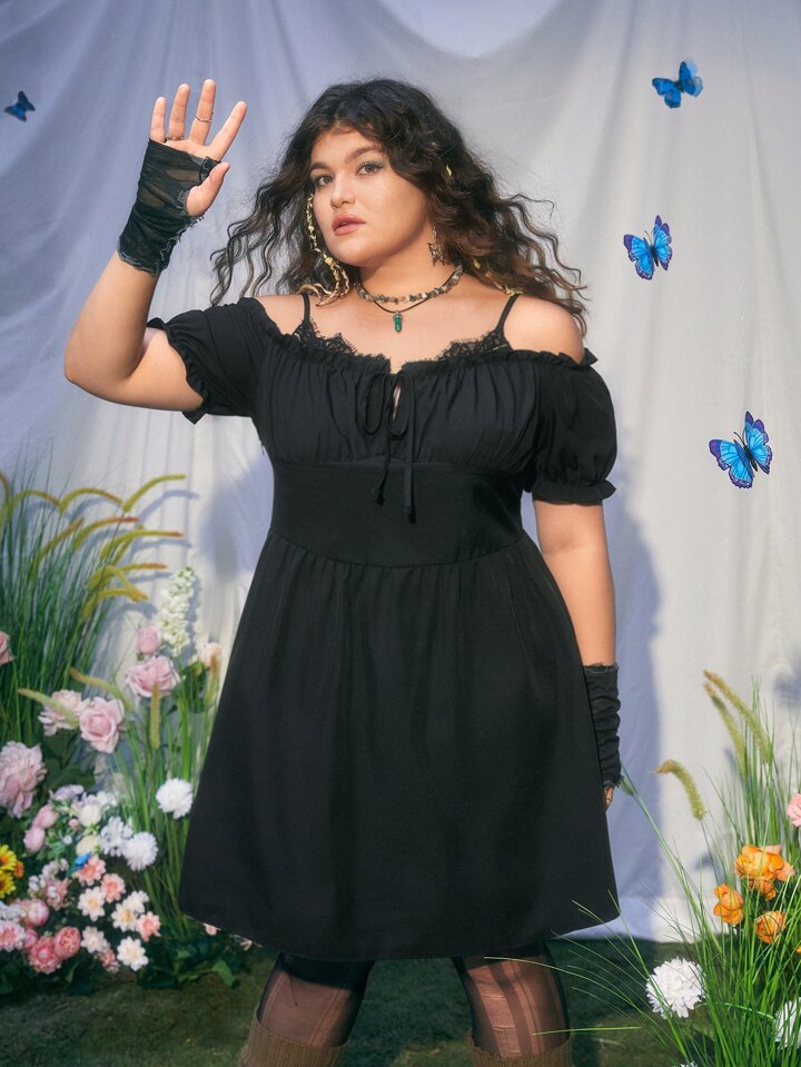 Fairycore Plus Cold Shoulder Knot Front Ruched Bust Dress