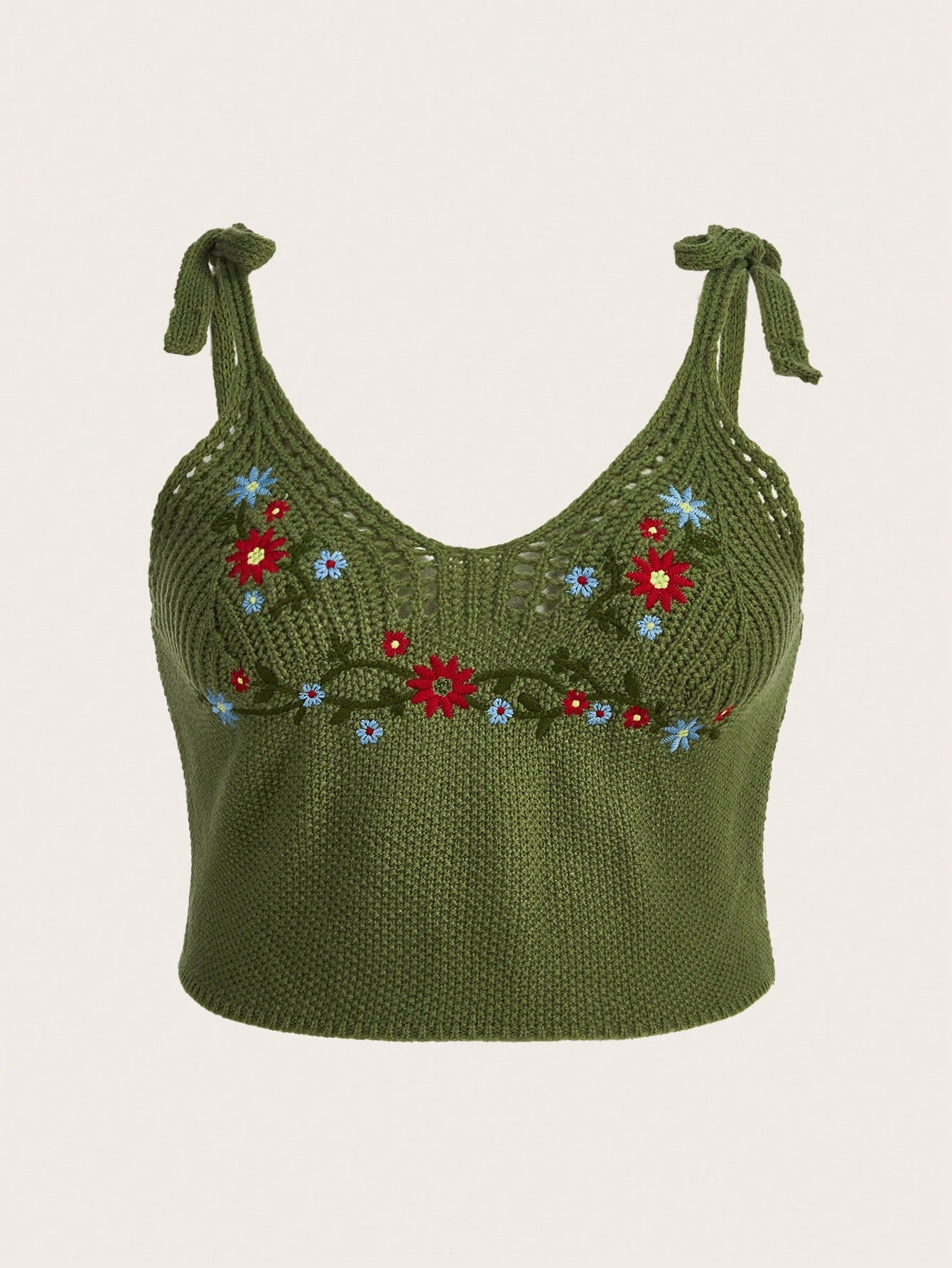 Fairycore Plus Floral Embroidery Tie Shoulder Cami Knit Top