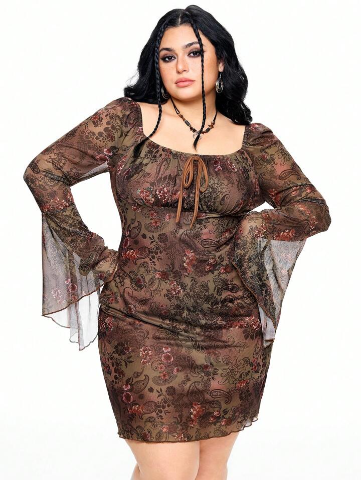 Fairycore Plus Size Women Boho Western Wear Floral And Paisley Print Long Flare Sleeve Vintage Dress