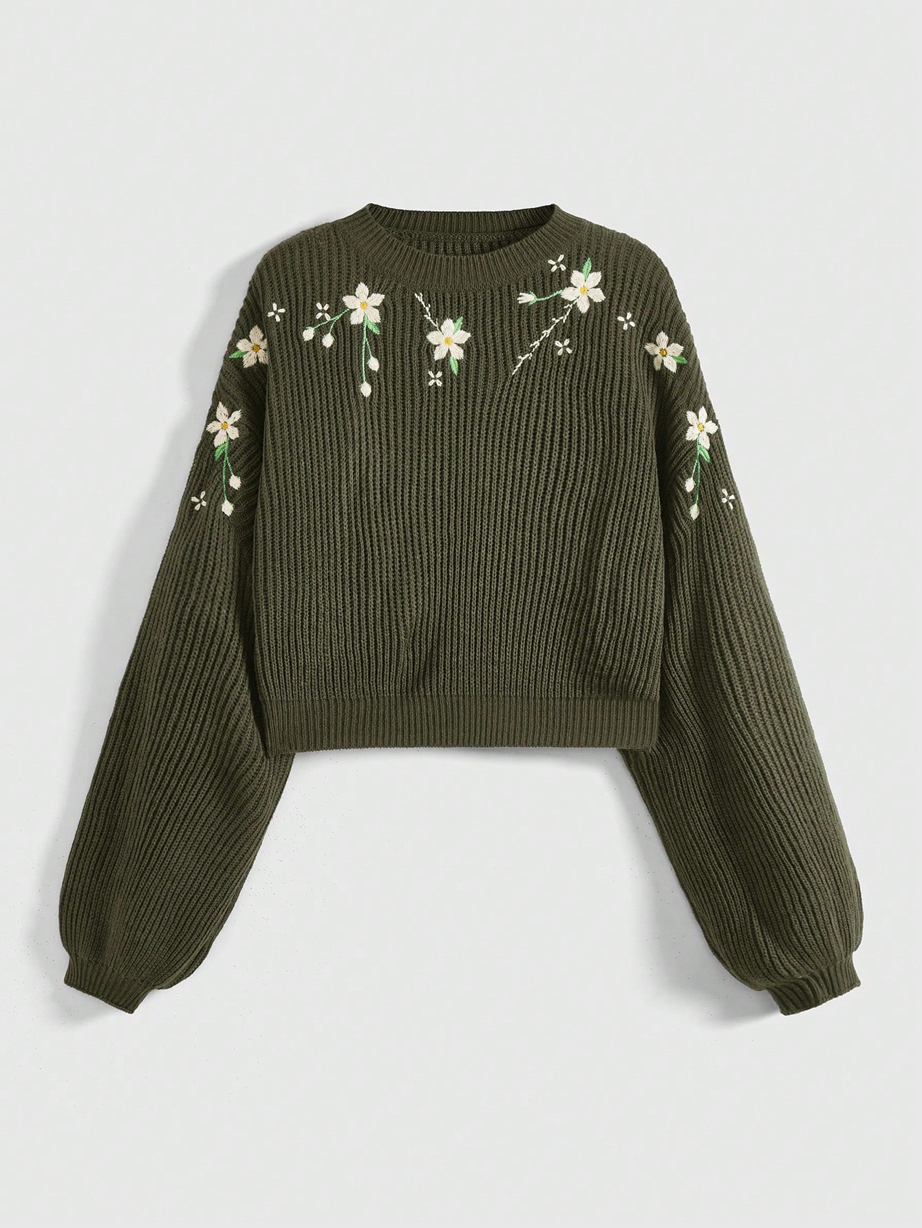 Fairycore Plus Size Women Casual Floral Embroidery Drop Shoulder Loose Cropped Sweater, Autumn/Winter