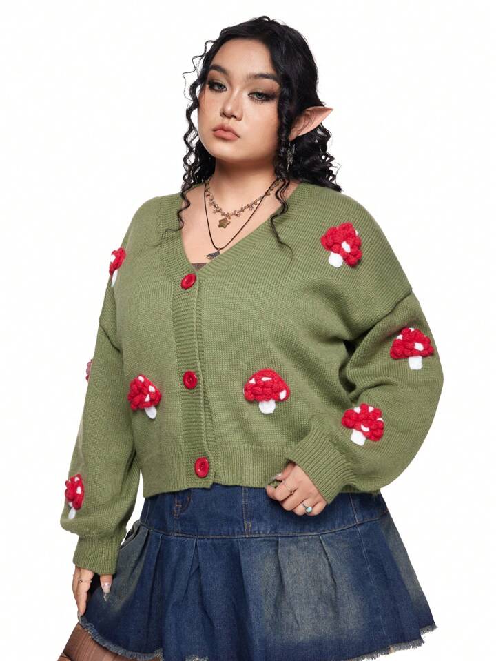 Fairycore Plus Size Women Casual Plus Size Drop Shoulder Mushroom Pattern Button Front Cardigan, Winter
