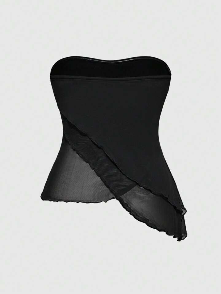 Fairycore Plus Size Women Holiday Style Solid Color Asymmetrical Mesh Patchwork Hem Strapless Crop Top