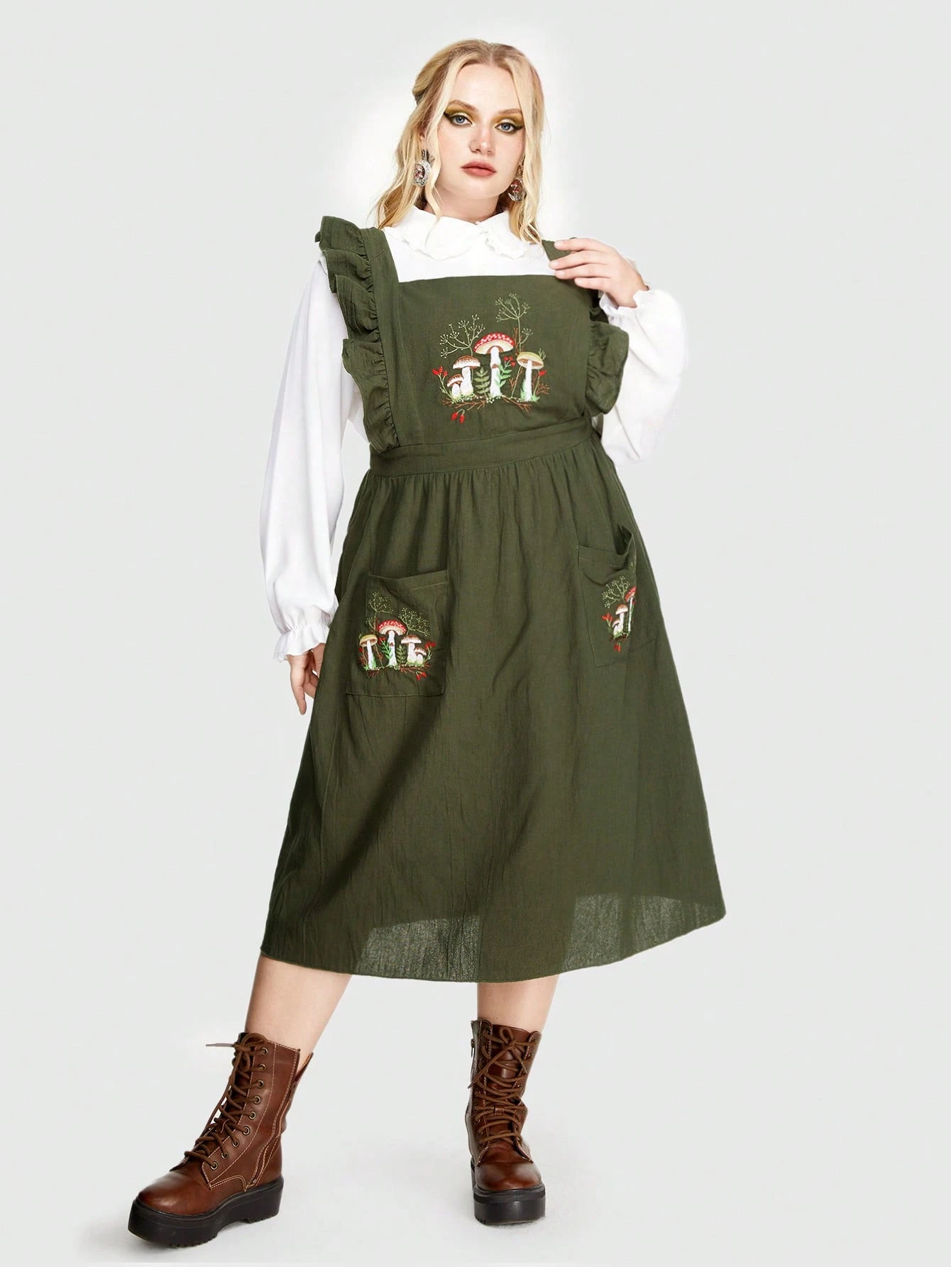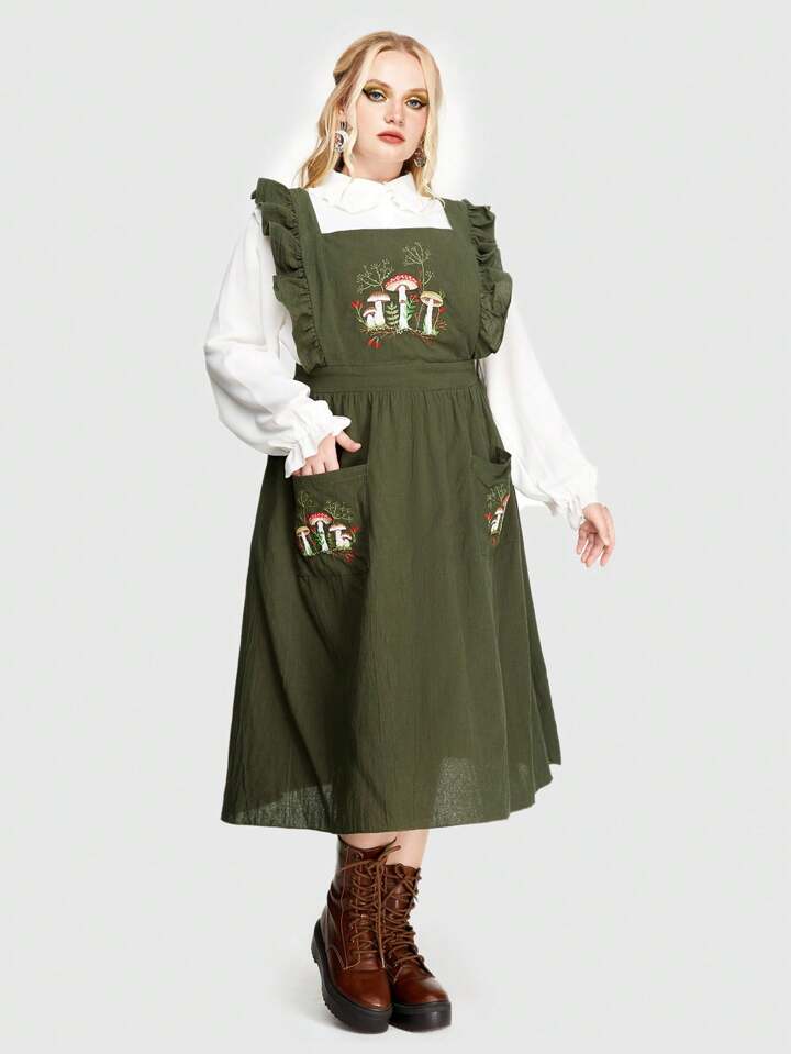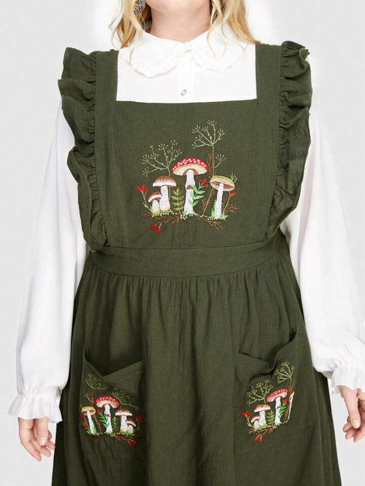 Fairycore Plus Size Women's Dress With Mushroom Embroidery, Ruffled Apron Style Dress