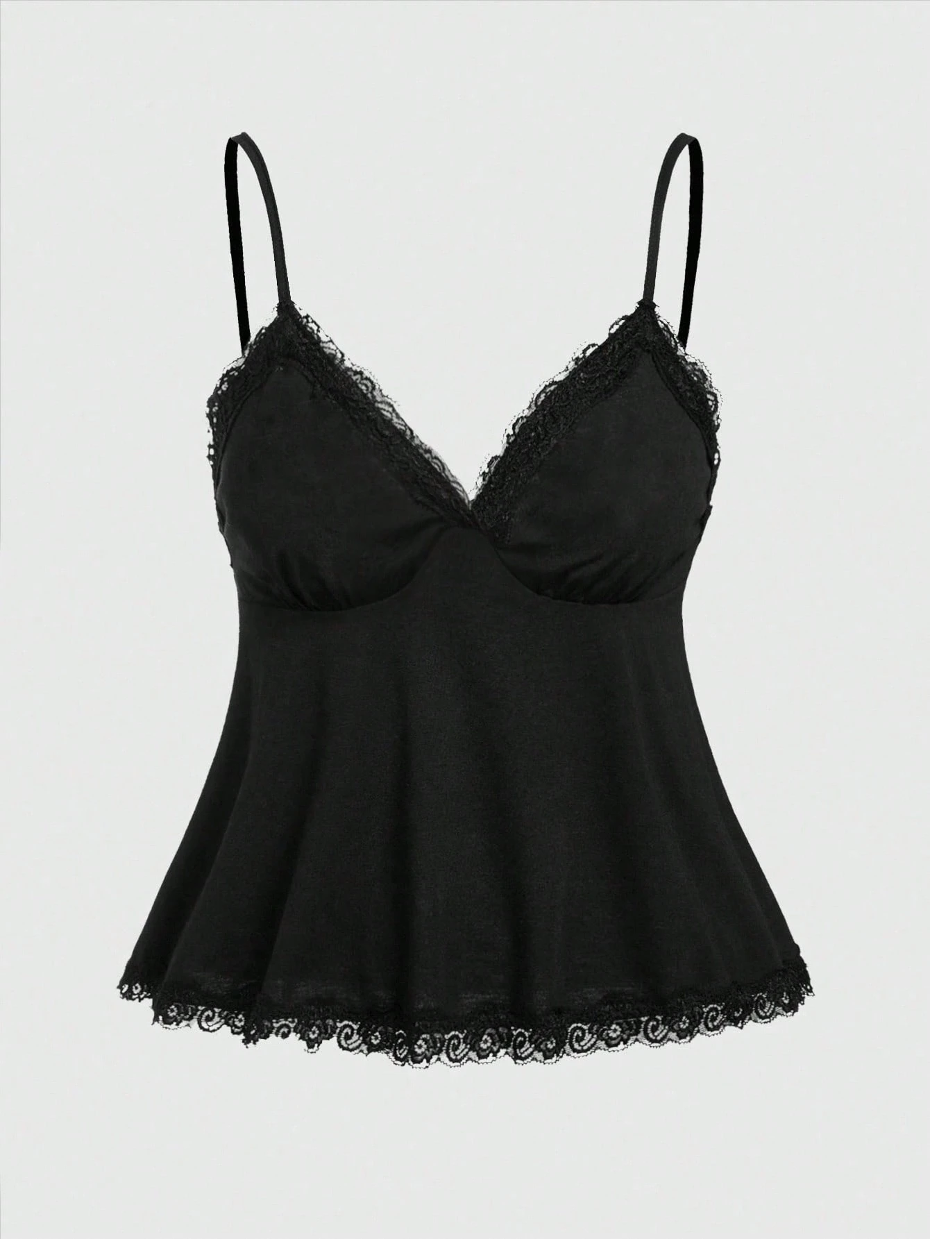 Fairycore Plus Size Women's Lace Patchwork Ruffle Hem Cami Tank Top With Spaghetti Straps