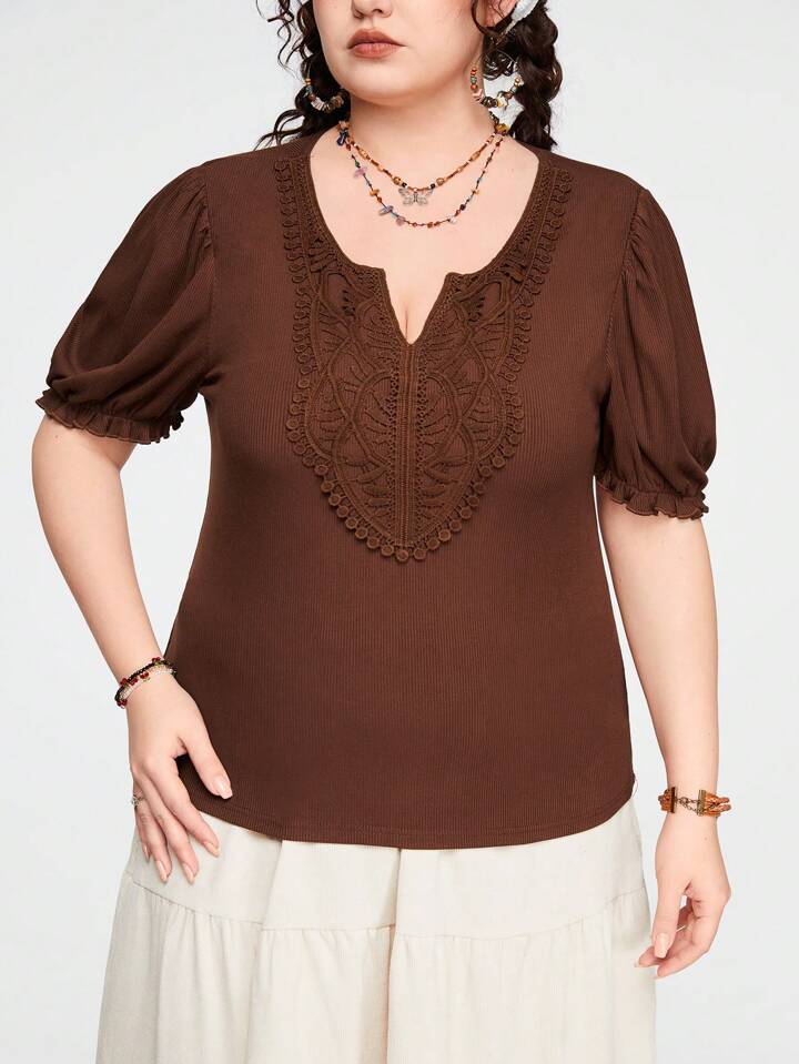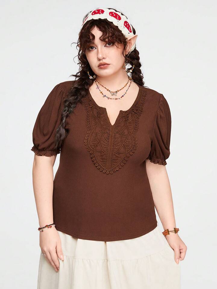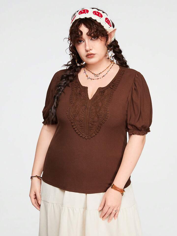 Fairycore Plus Size Women's Tight Lace Floral Puff Sleeve T-Shirt