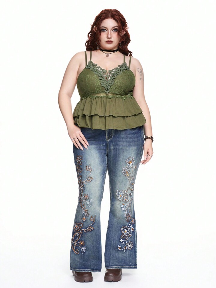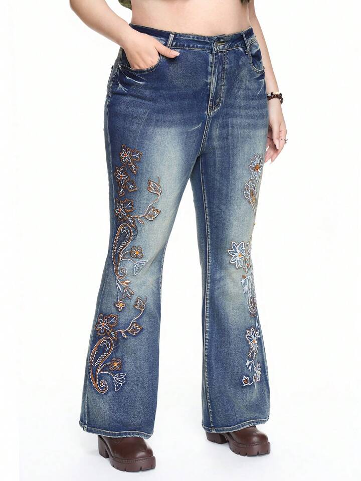 Fairycore Plus Size Women's Vintage Vine Embroidery Pearl Beaded Paisley Floral Print Flared Leg Jeans Pants