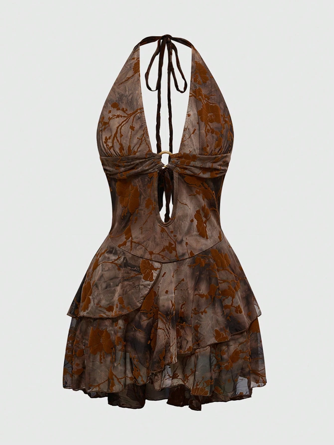 Fairycore Sexy Deep V-Neck Open Back Tie-Dye Flocked Floral Print Mini Dress, Suitable For Vacation/Nature Themed