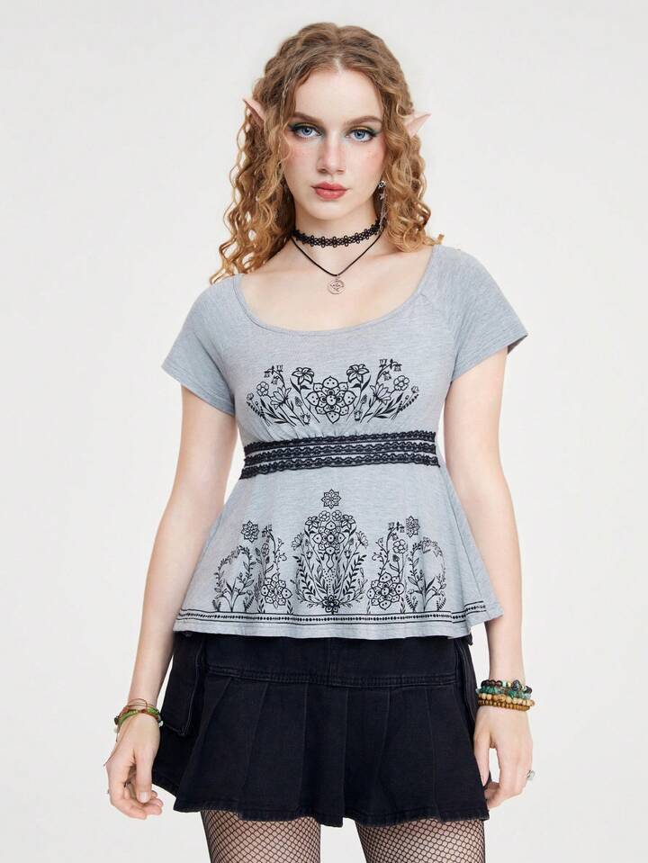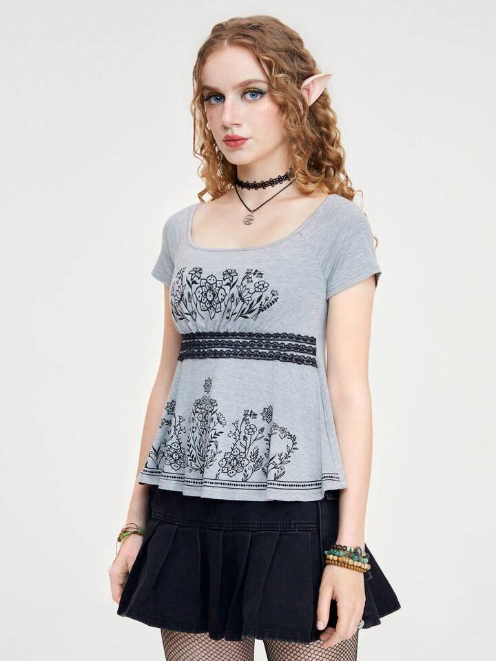 Fairycore Sexy Low-Cut Lace Trimmed Waist Fitted T-Shirt For Women With Flower, Rhinestone, And Plant Leaf Decorations
