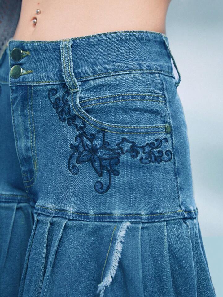Fairycore Star Embroidery Pleated Raw Hem Denim Skirt