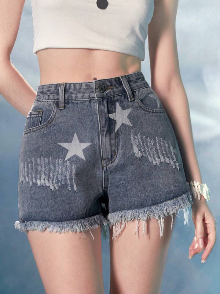 Fairycore Star Print Raw Hem Denim Shorts