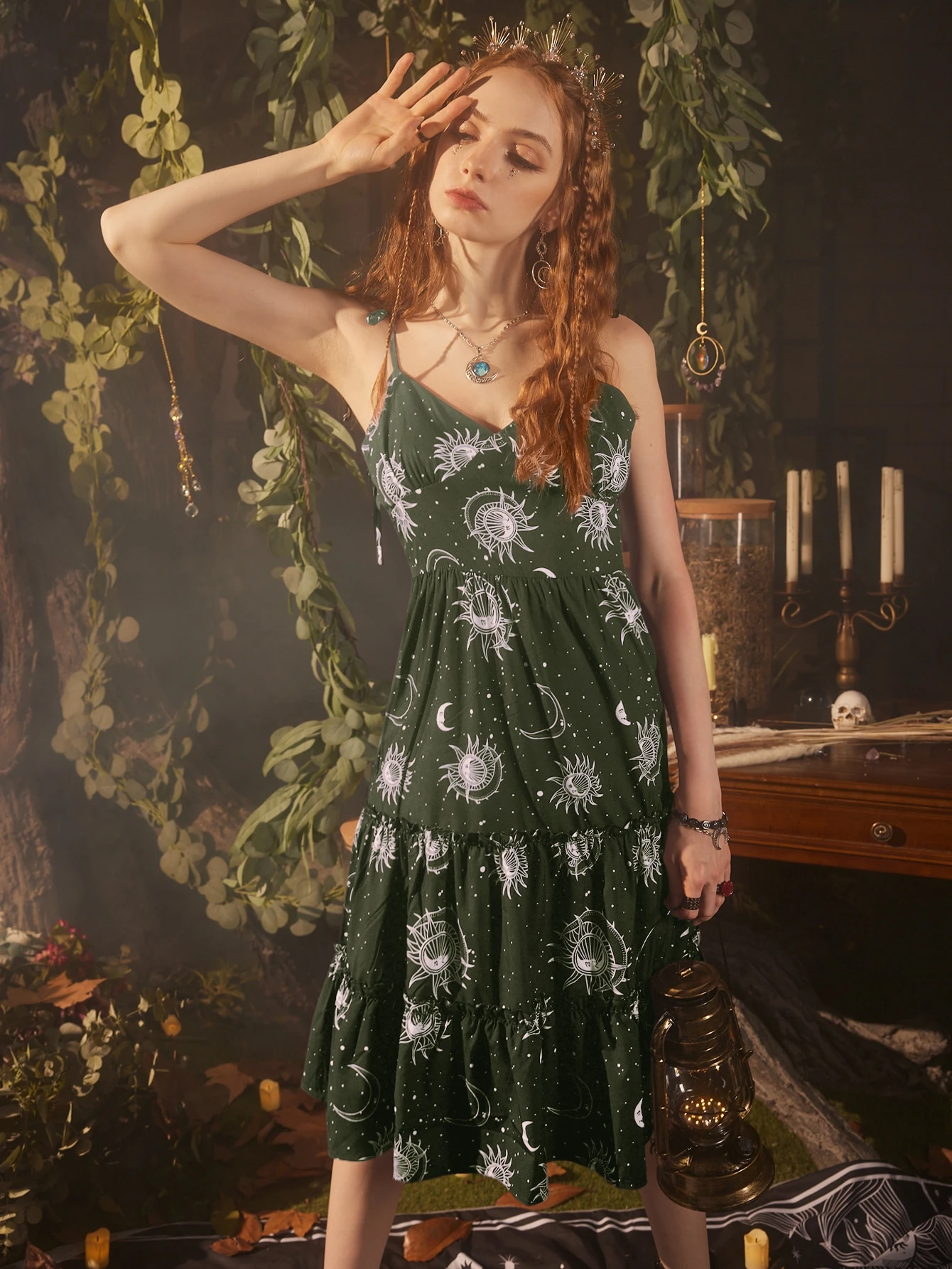 Fairycore Sun & Moon Graphic Ruffle Hem Cami Dress