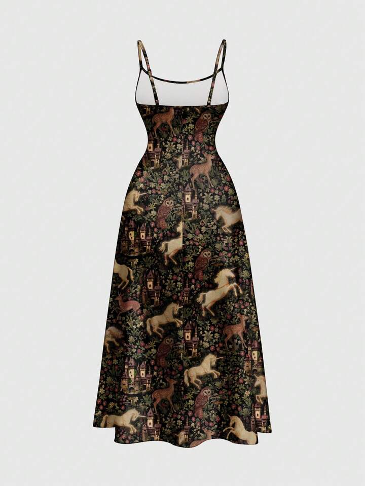 Fairycore Vintage Optimized Palace Retro European Garden French Elegant Horse & Floral Magic A-Line Ruffle Strap Dress For Women