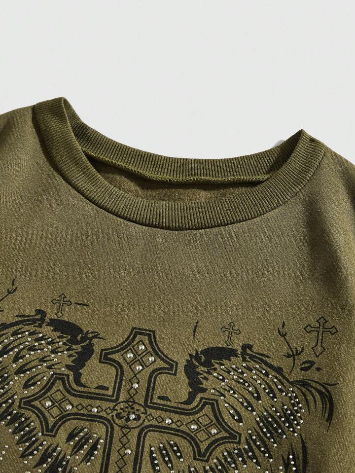 Fairycore Wing Pattern Rhinestone Embellished Crew Neck Thick Long Sleeve Sweatshirt