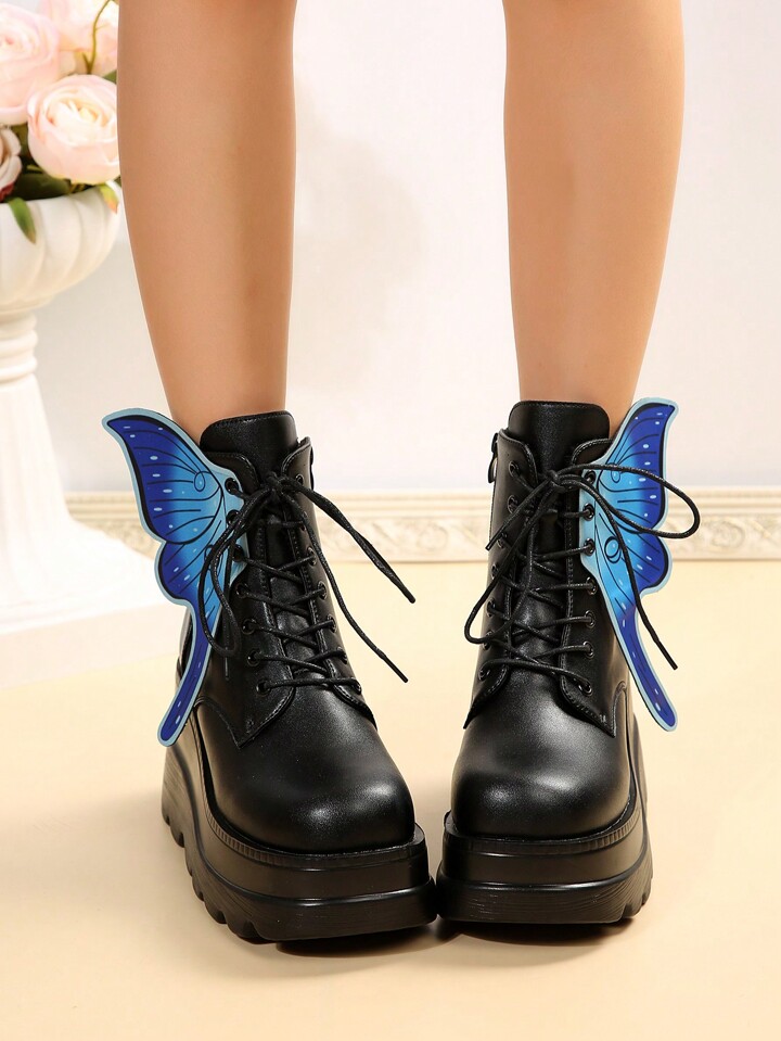 Fairycore Women Butterfly Decor Lace-up Front Round Toe Wedge Boots, Fashion Outdoor Boots