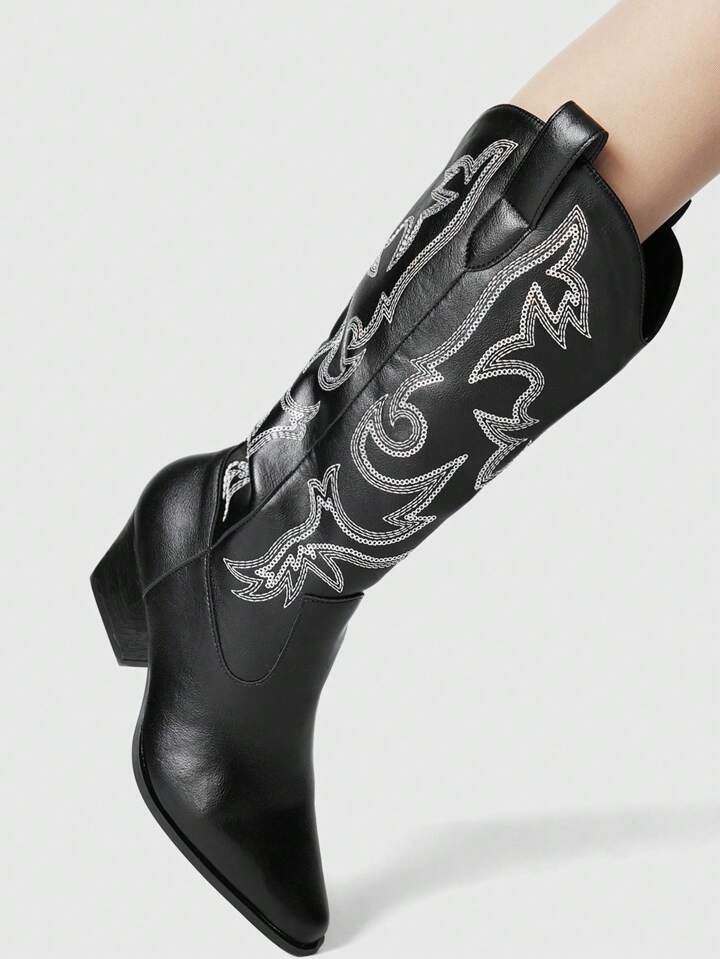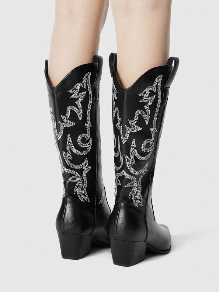 Fairycore Women Graphic Totem Embroidery Pointed Toe Low Heel Hippie Western Boots, PU Black Knee-High Boots For Daily Cowgirl Style