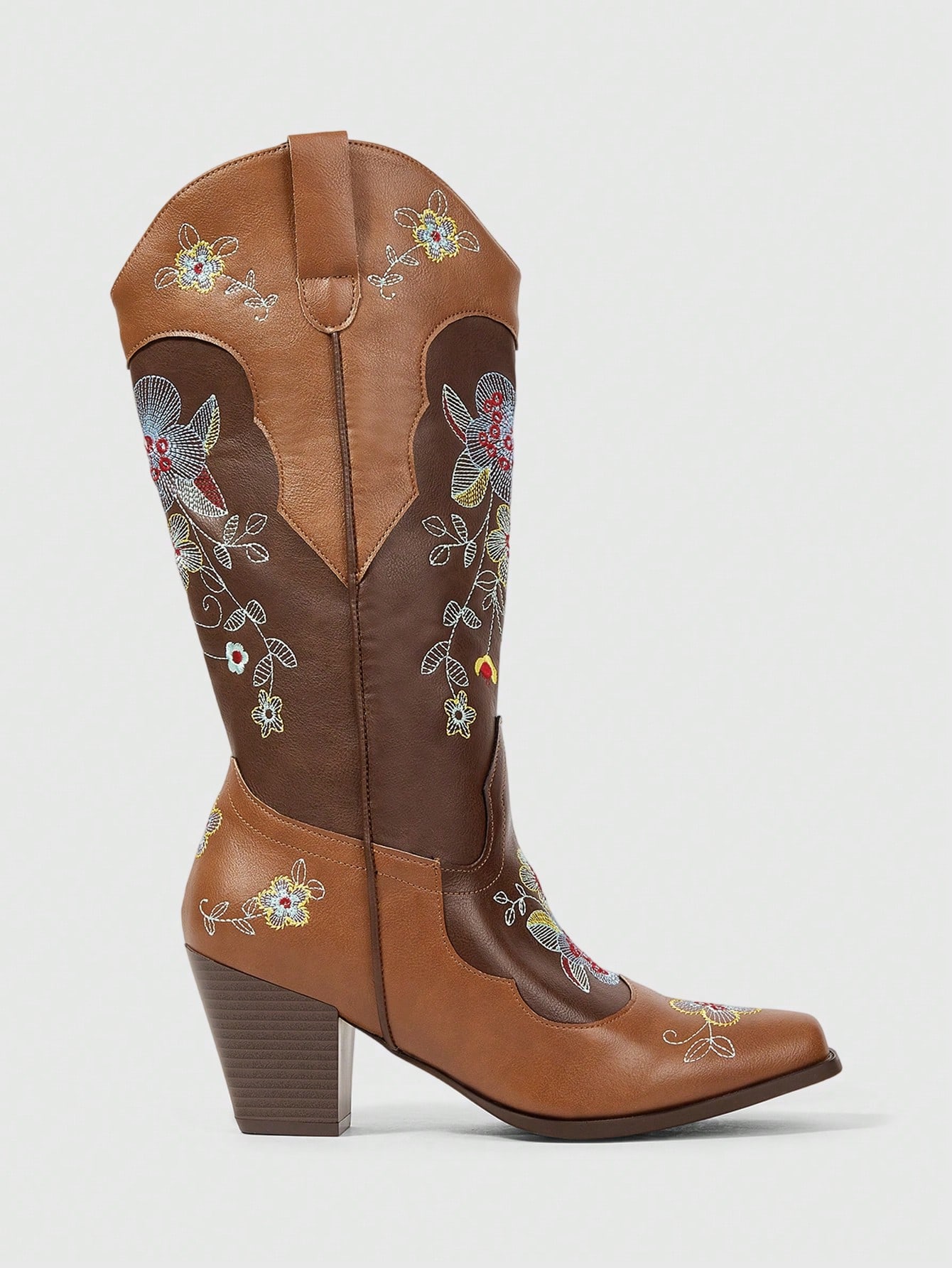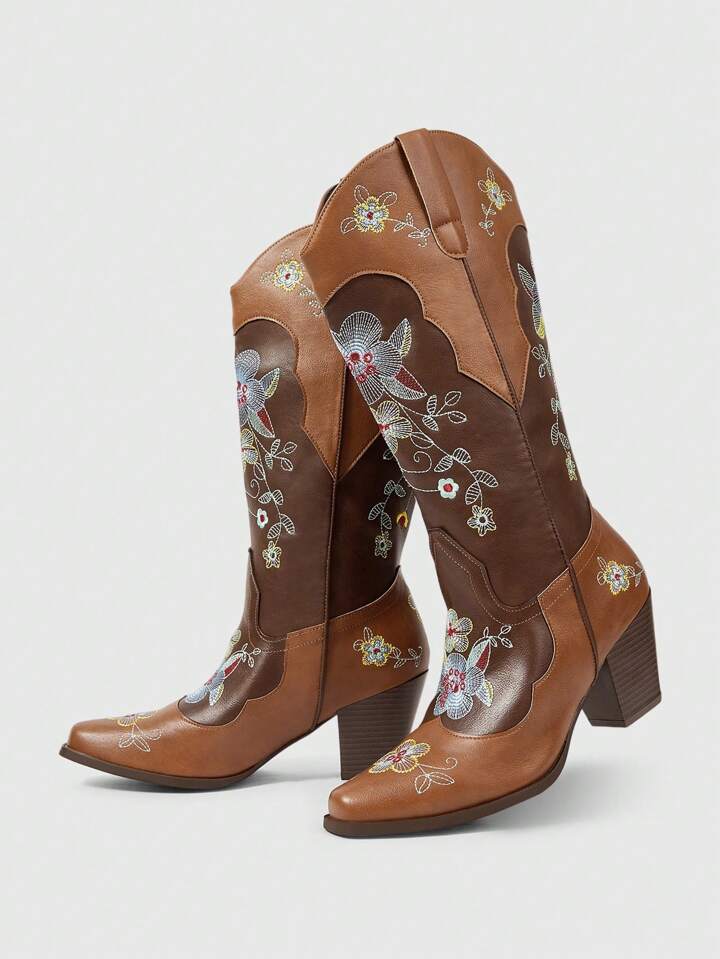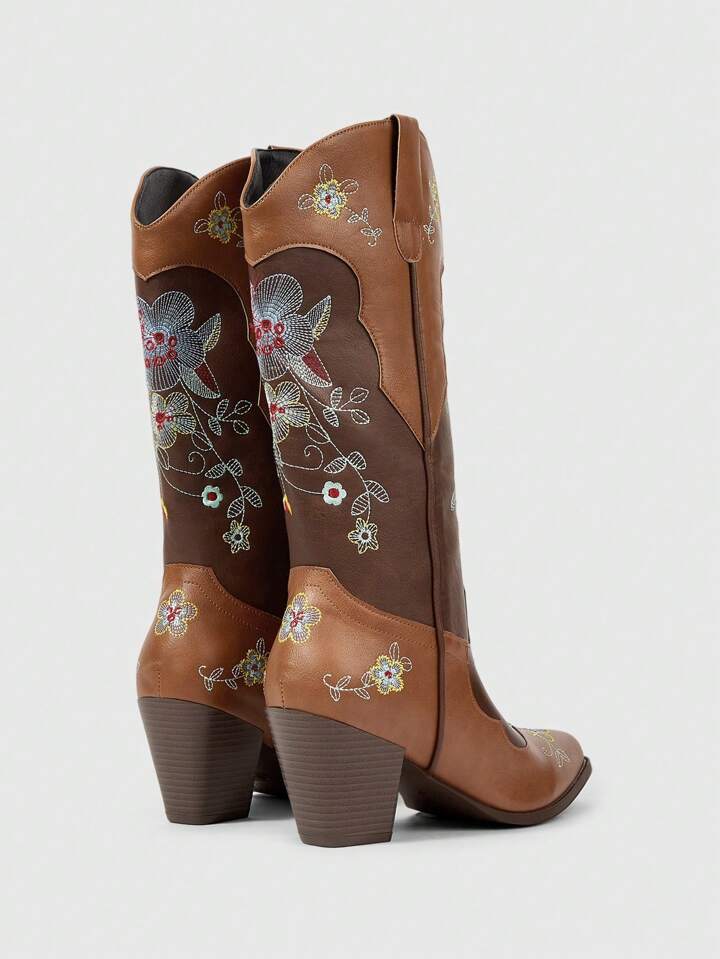 Fairycore Women's Brown Cowgirl Boots Slip-On Color-Block Embroidered Western Boots, Outdoor Fashion Casual Knee-High Riding Boots
