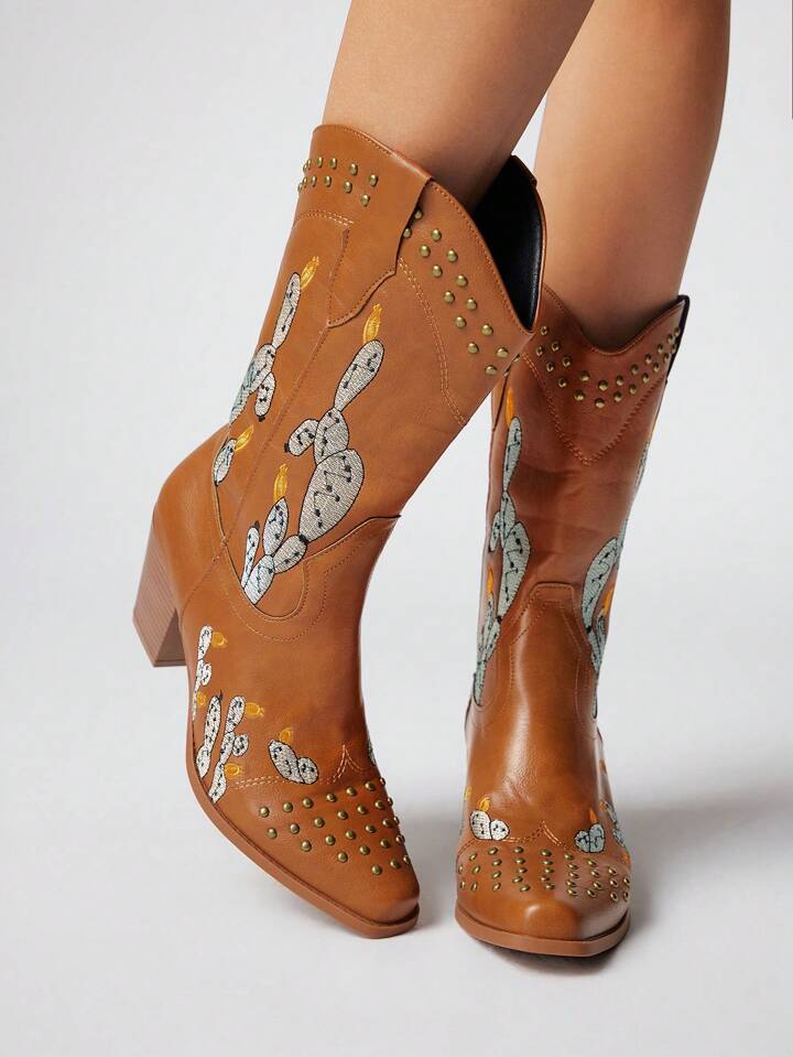 Fairycore Women's Cowgirl Boots, Slip-On, Color Block Detail Embroidery Western Boots, Outdoor Fashion Casual Knee-High Riding Boots
