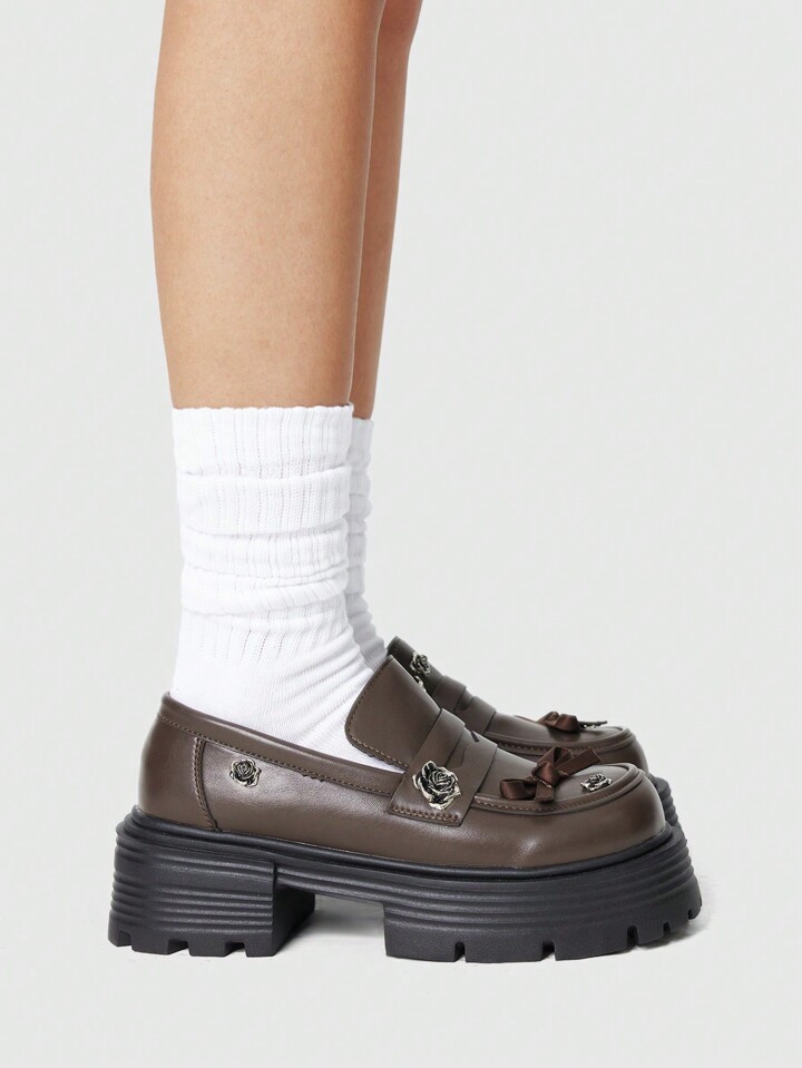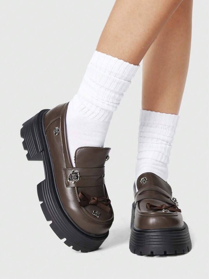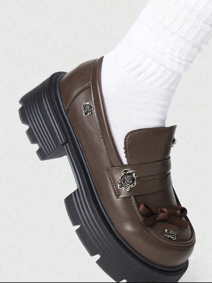 Fairycore Women's Dark Punk Gothic Mary Jane Shoes, Closed Toe Small Leather Preppy Black Slip-On Loafers With Platform & Chunky Heels