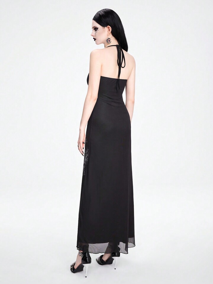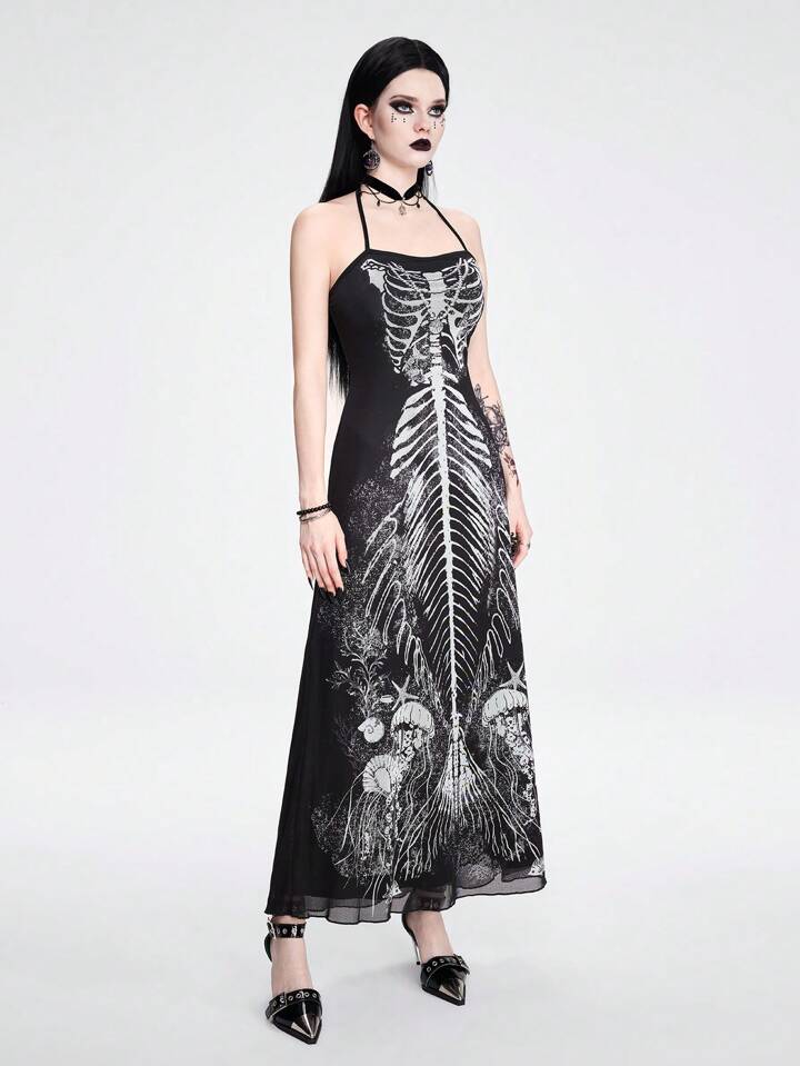 Fairycore Women's Fashionable Mesh Halter Mermaid Skeleton Print Dress