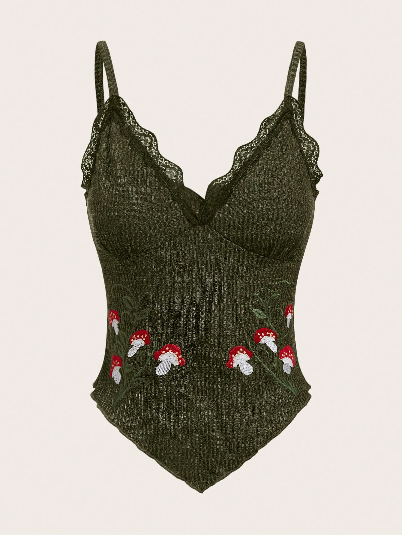 Fairycore Women's Lace Trim V Neck Dark Green Mushroom Pattern Top