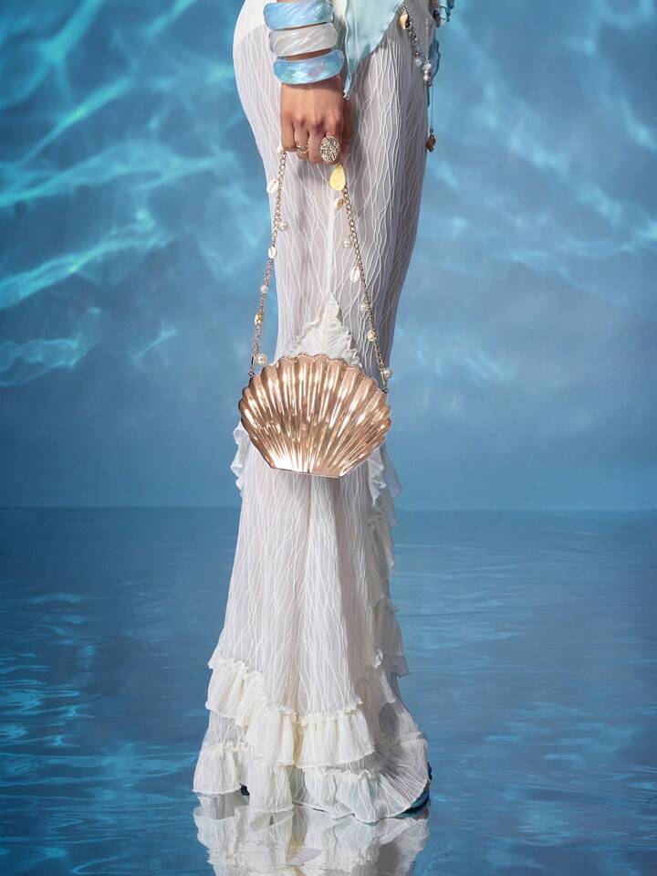 Fairycore Women's Light Golden Metallic Shell-Shaped Clutch Bag With Pearl& Shell Chain Strap, Elegant Beach Vacation Evening Purse For Seaside Parties & Resort Outing