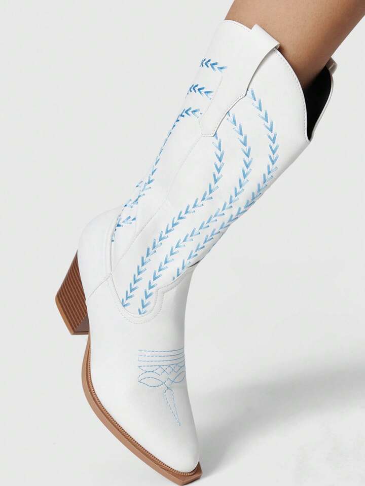 Fairycore Women's Pointed Toe Chunky Heel Elegant Embroidered Western Cowboy Boots, Fashion Mid-Calf Leather Boots For Spring And Autumn