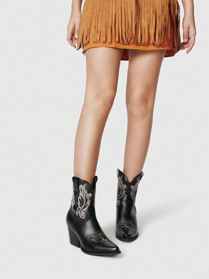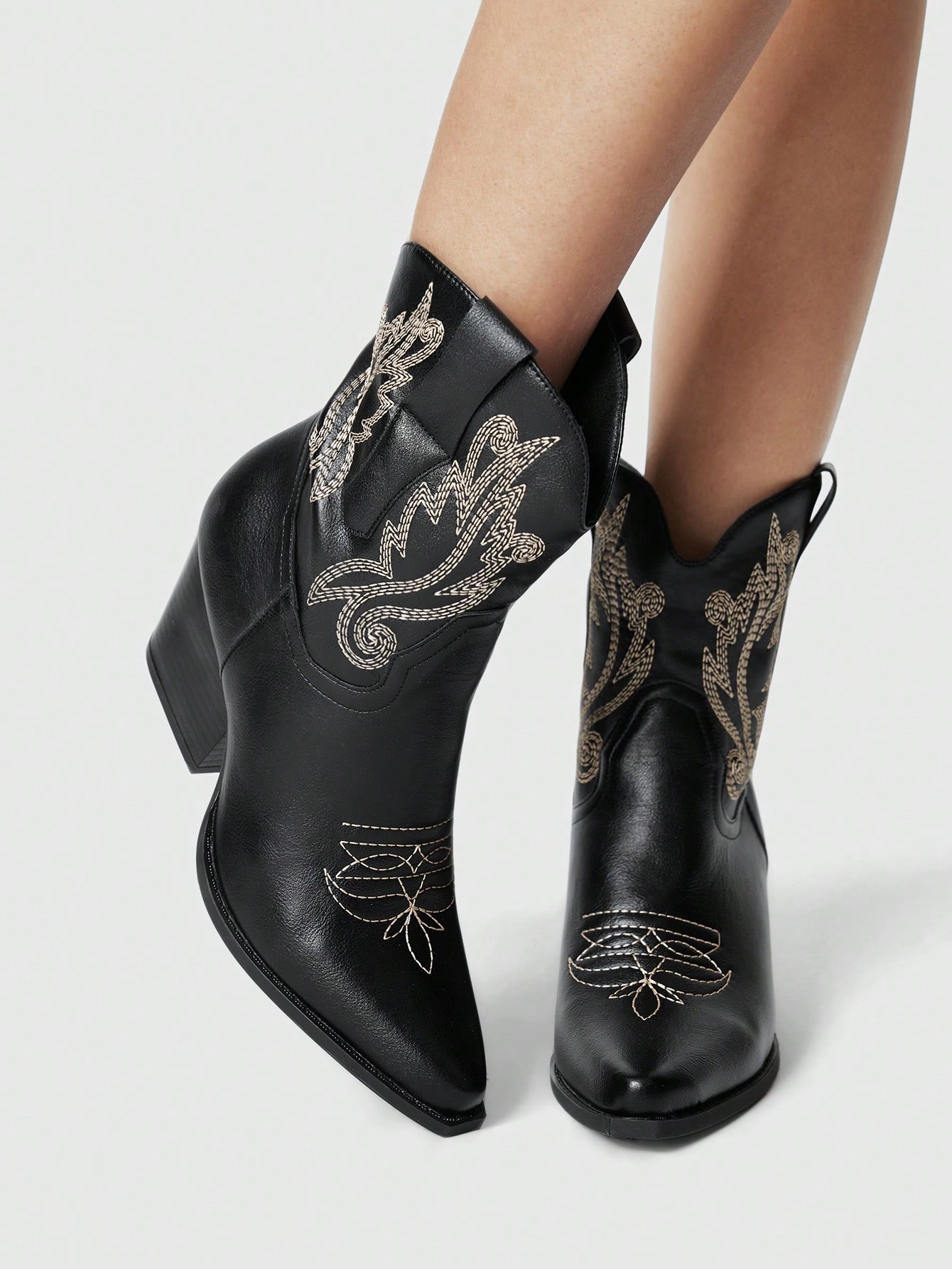 Fairycore Women's Pointed Toe Chunky Heel Symmetrical Embroidered Western Boots, Cowboy Boots, New Autumn/Winter Leather Slip-On Ankle Boots & Short Boots, Cowgirl Boots For Christmas