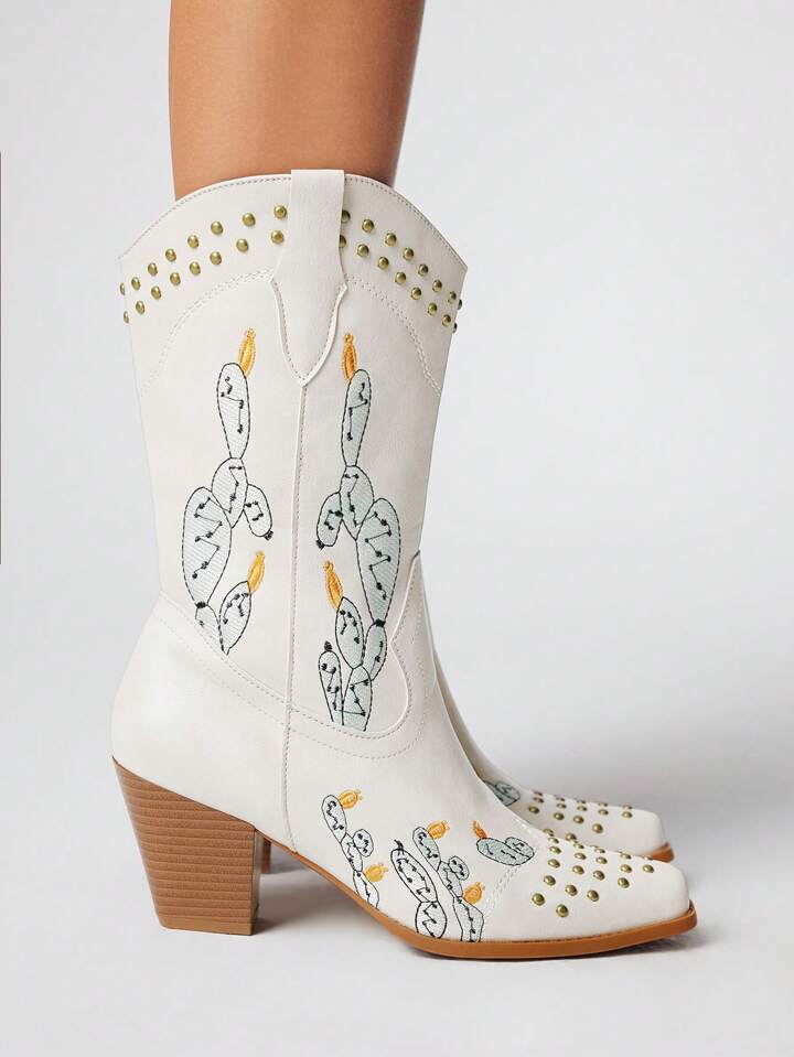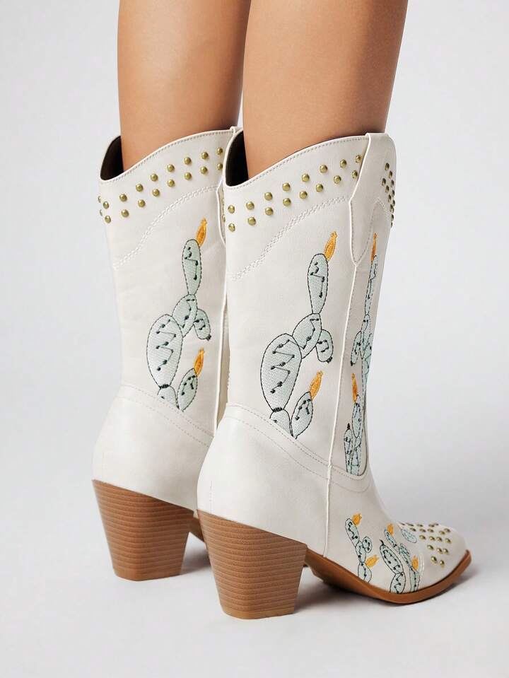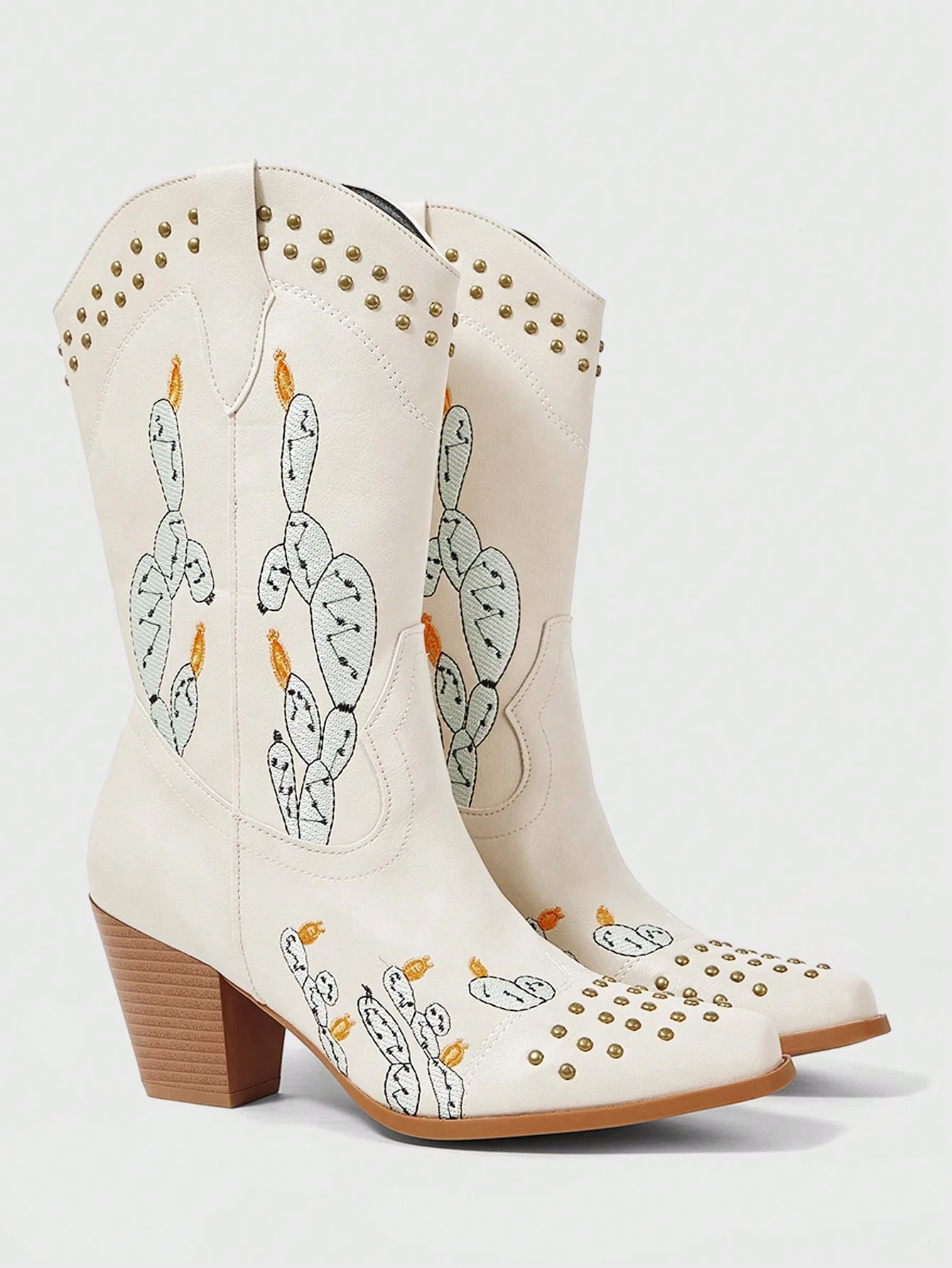 Fairycore Women's Pull-On Cowgirl Boots With Contrast Color Stitching Details, Western Style Outdoor Casual Calf Length Riding Boots