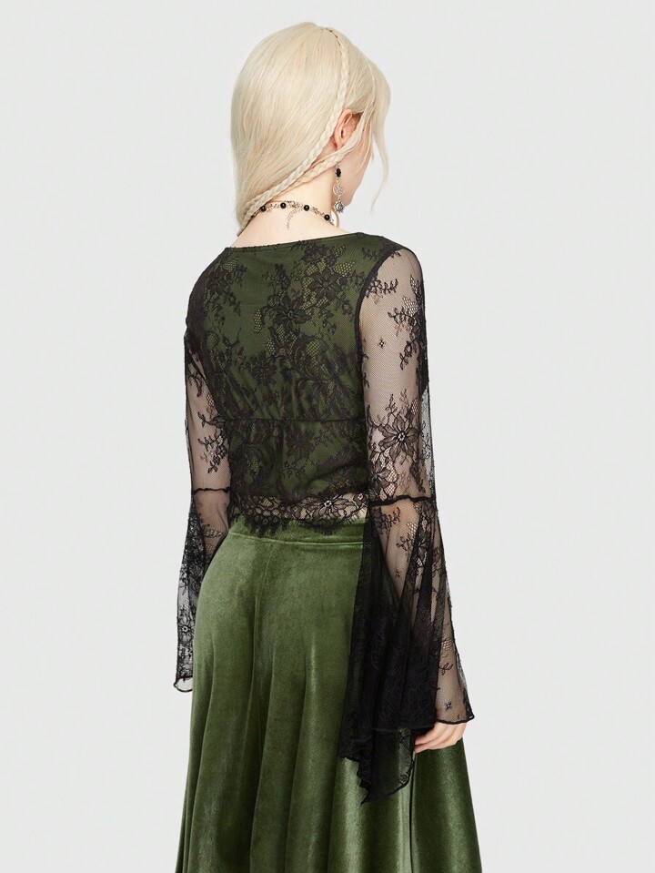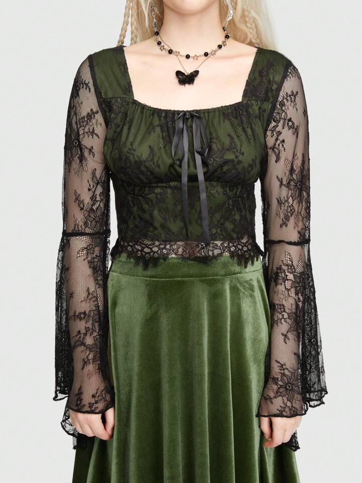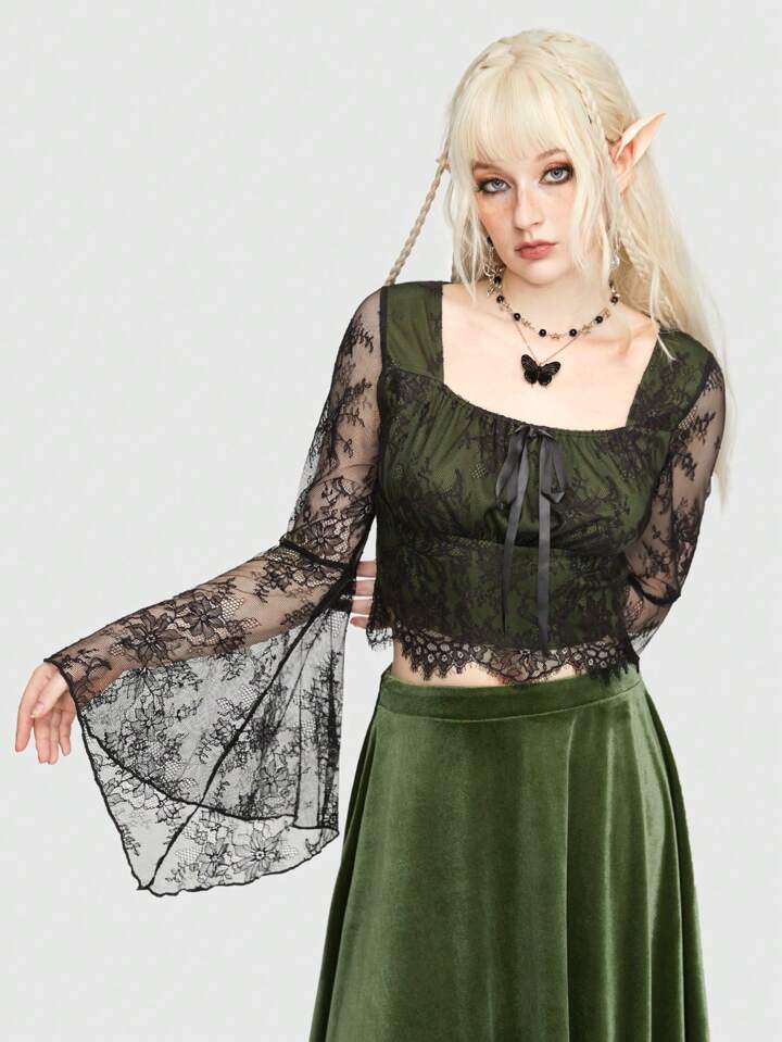 Fairycore Women's Tie Front Bell Sleeve Lace Shirt