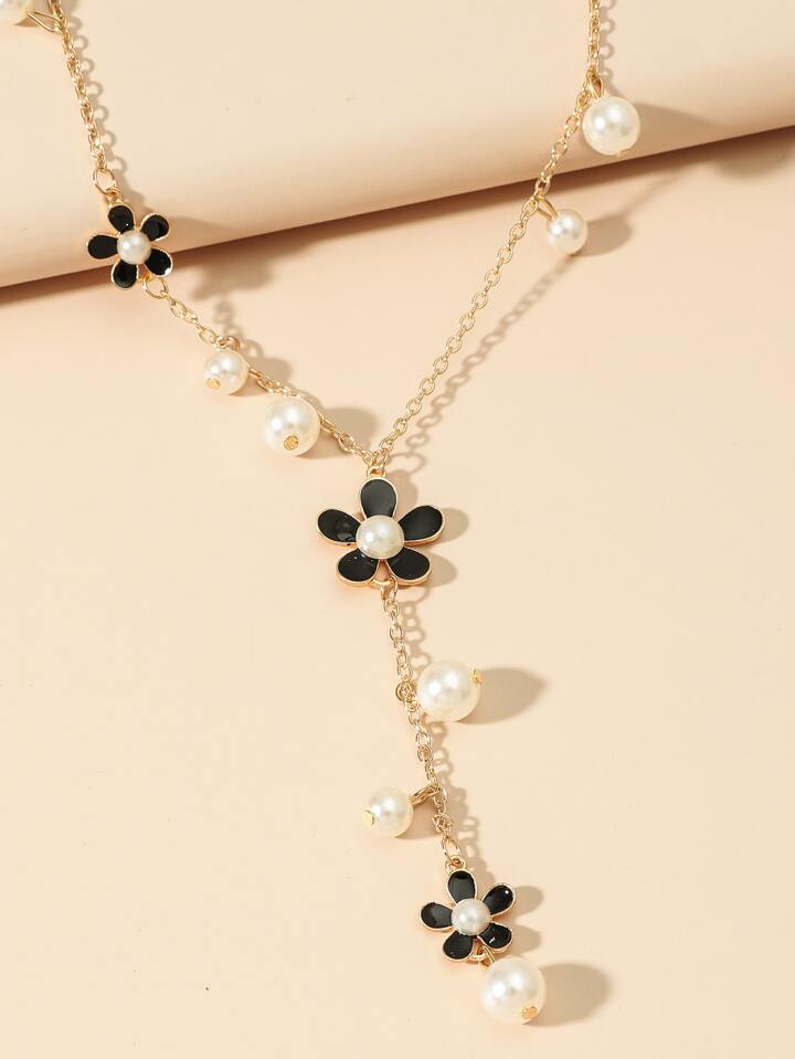 Faux Pearl & Flower Decor Y Lariat Necklace