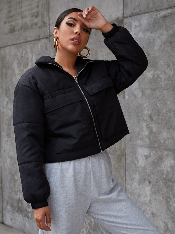 Flap Pocket Zipper Placket Puffer Jacket