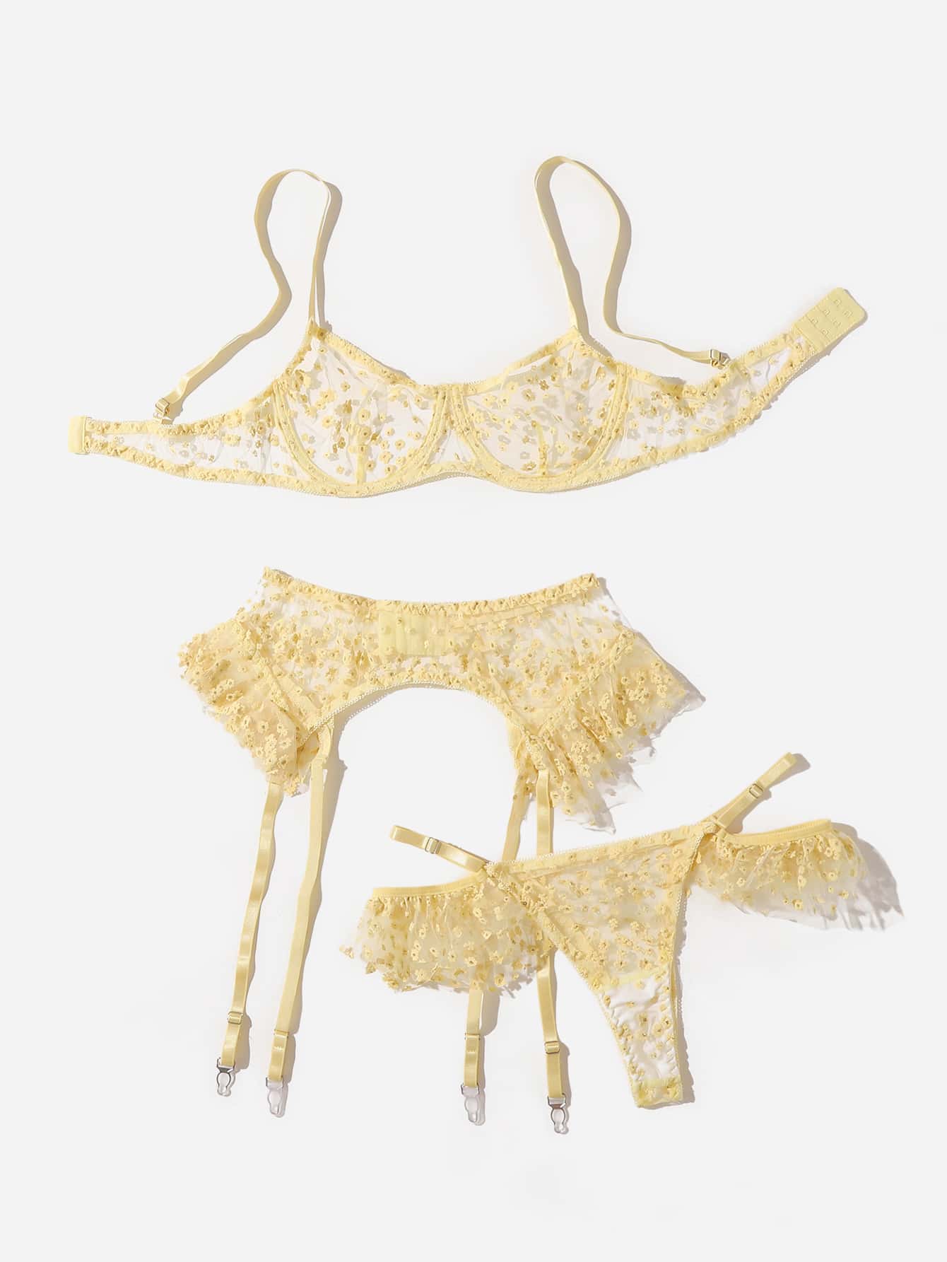 Floral Embroidered Mesh Underwire Garter Lingerie Set